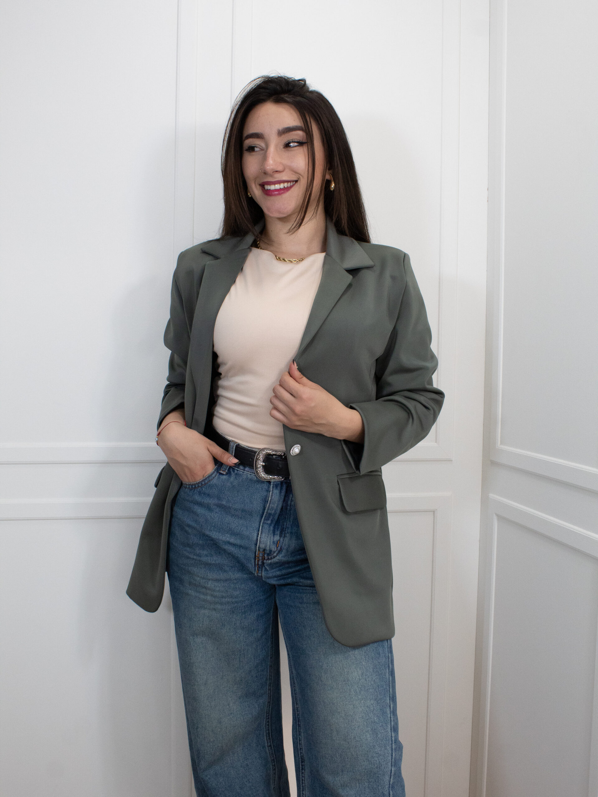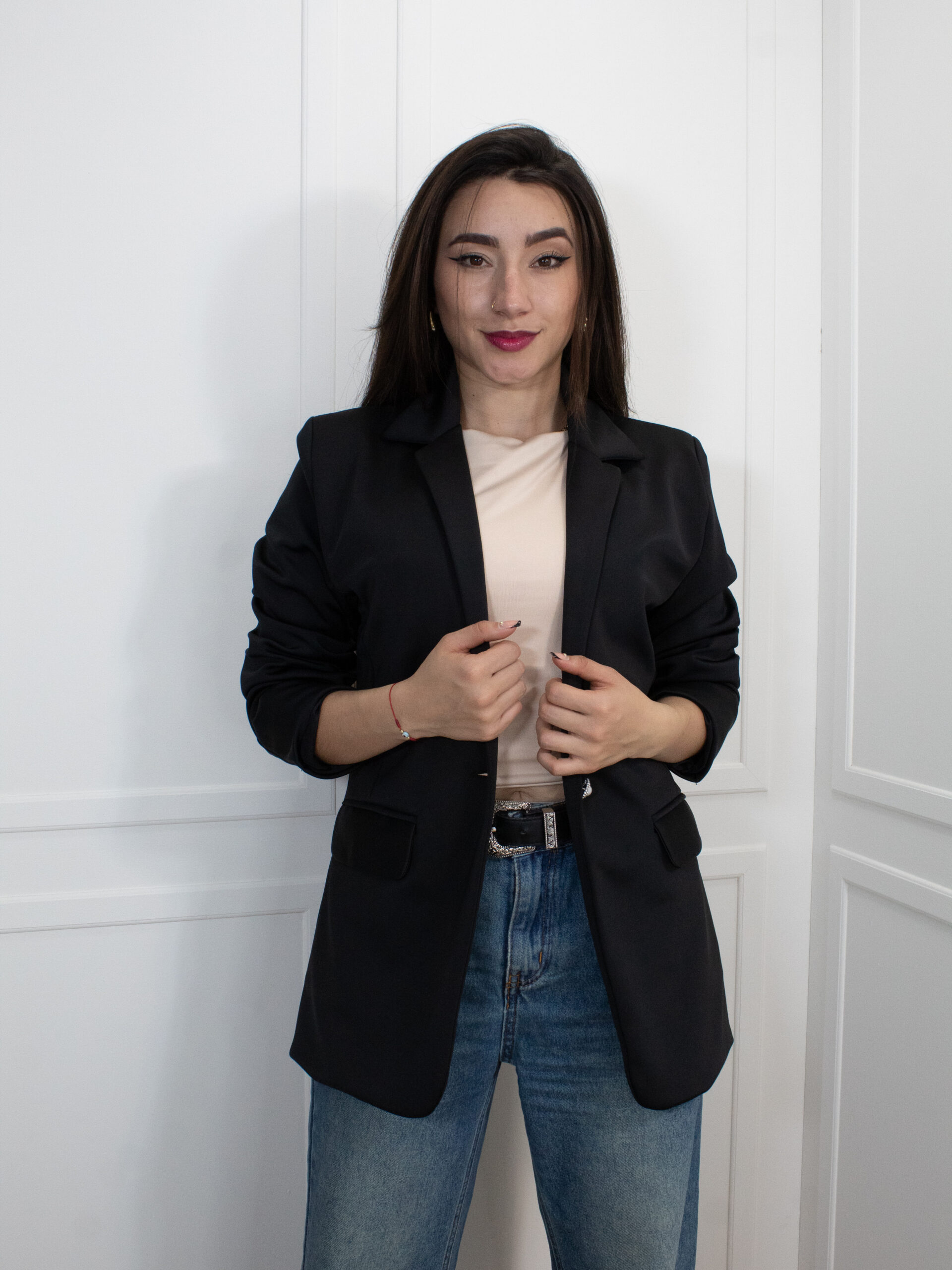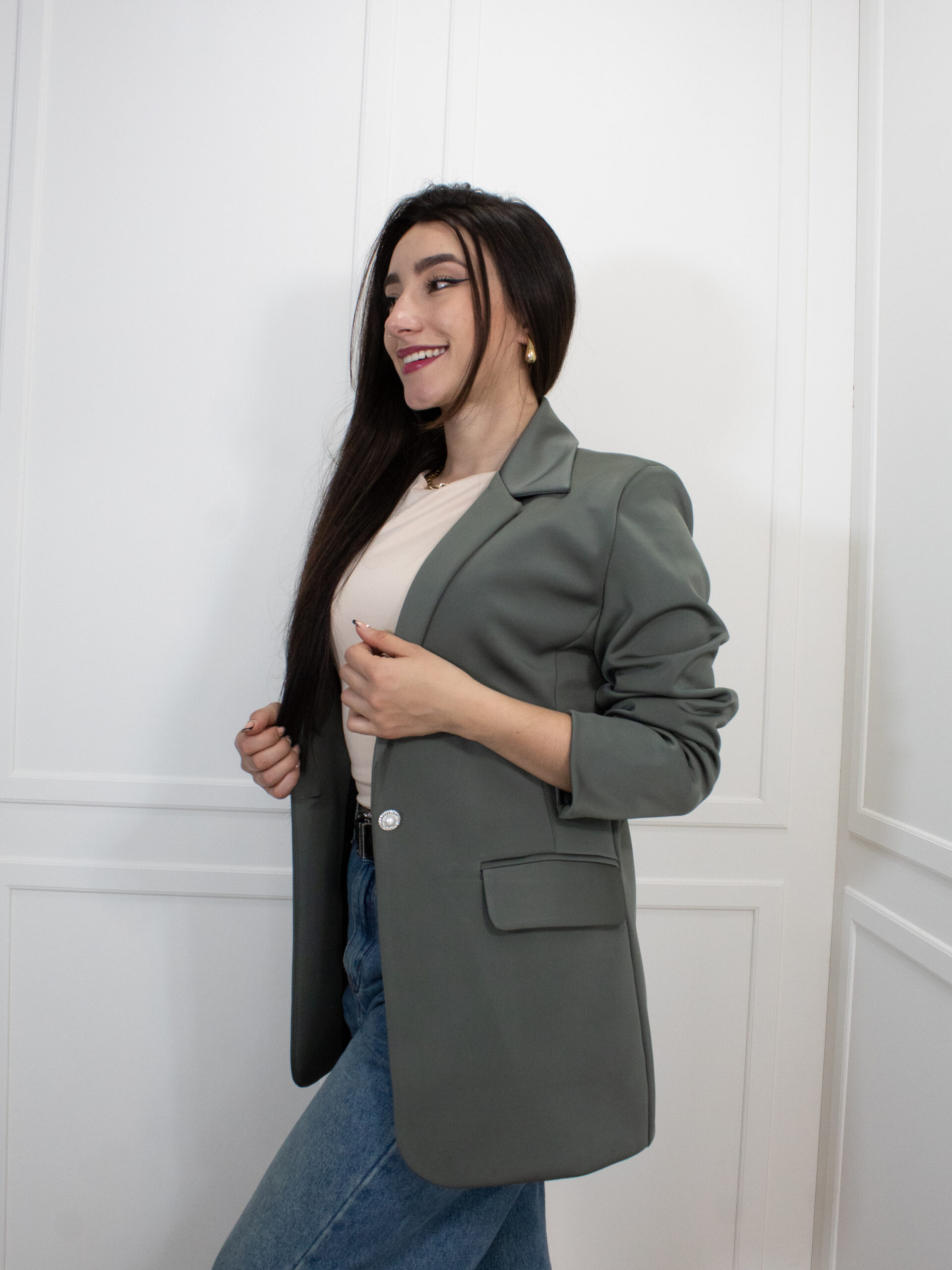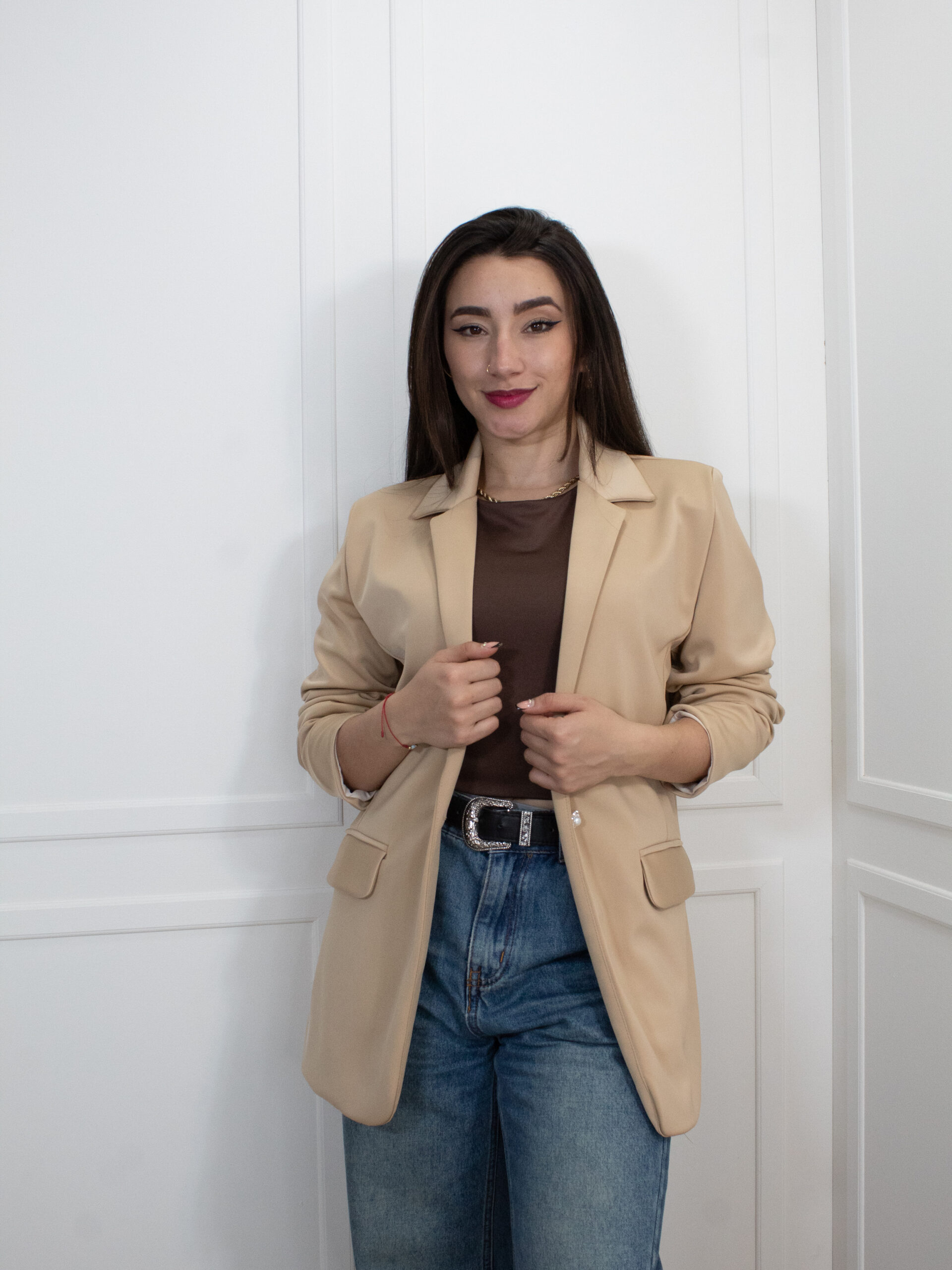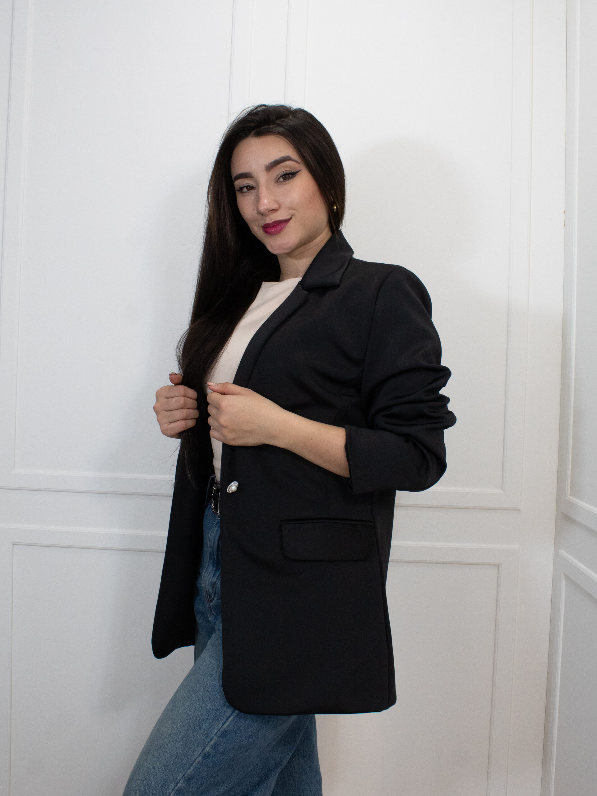 Blazer de estilo moderno y elegante, ideal para crear looks versátiles que se adaptan tanto a ocasiones formales como casuales.