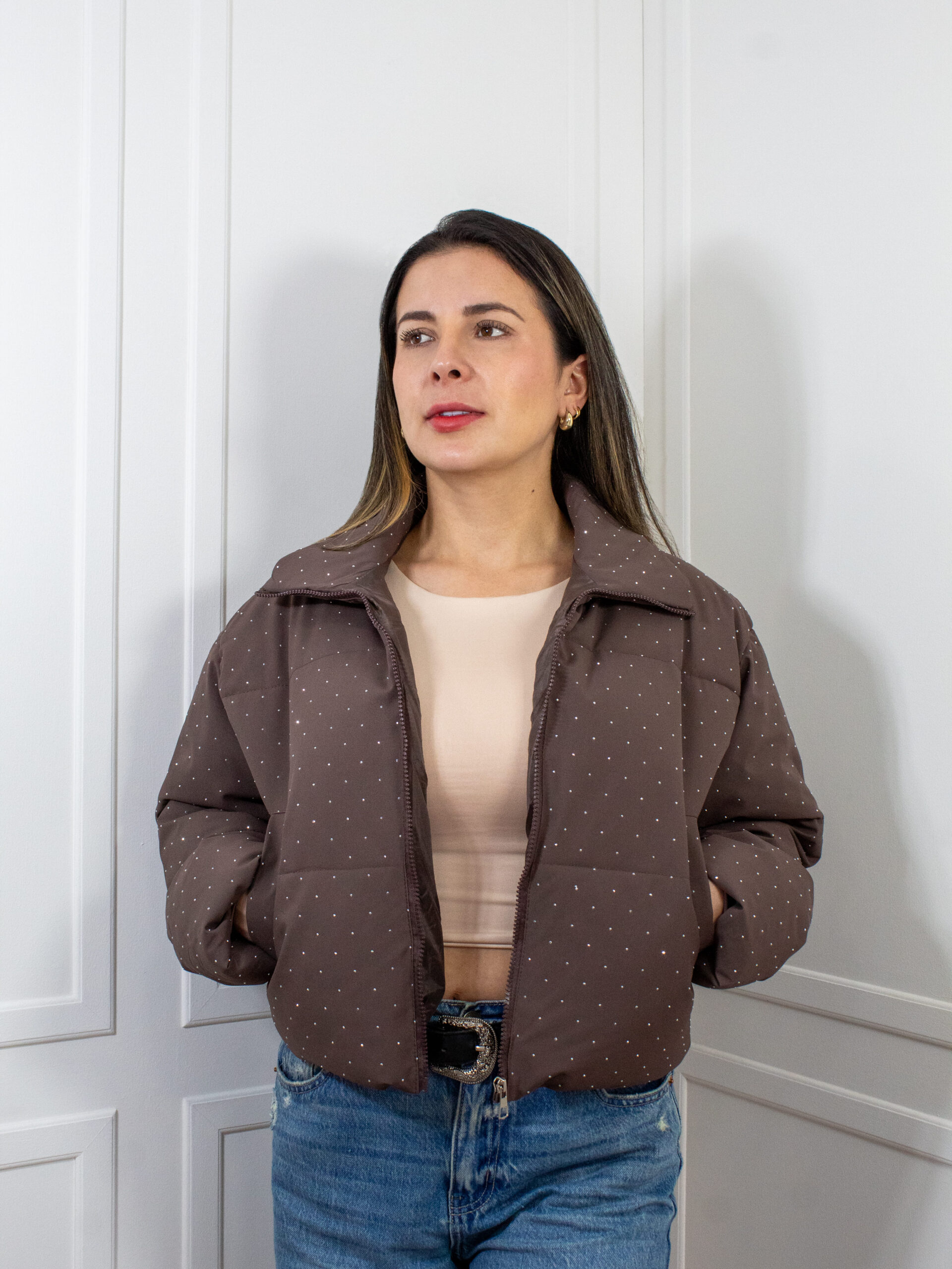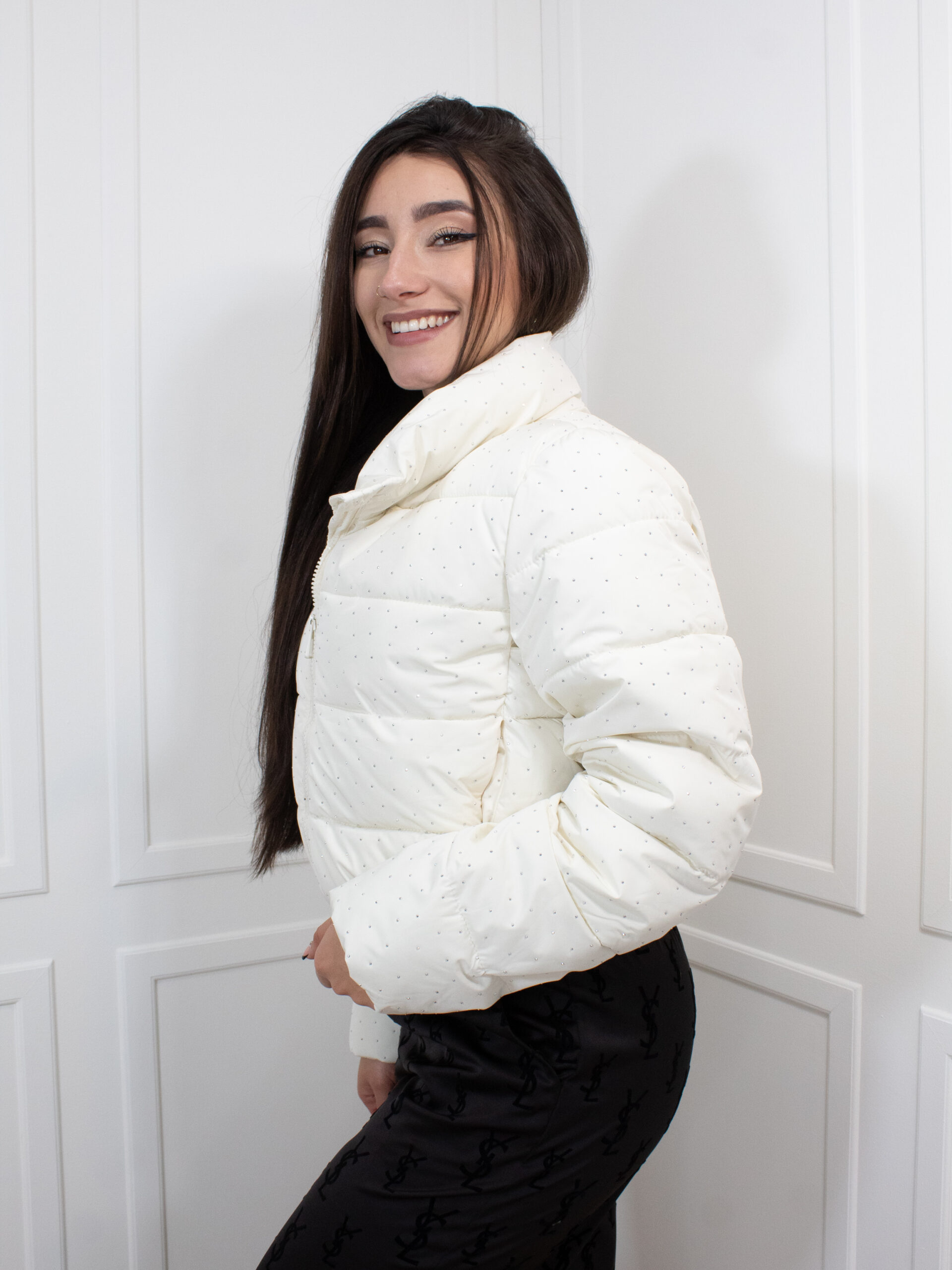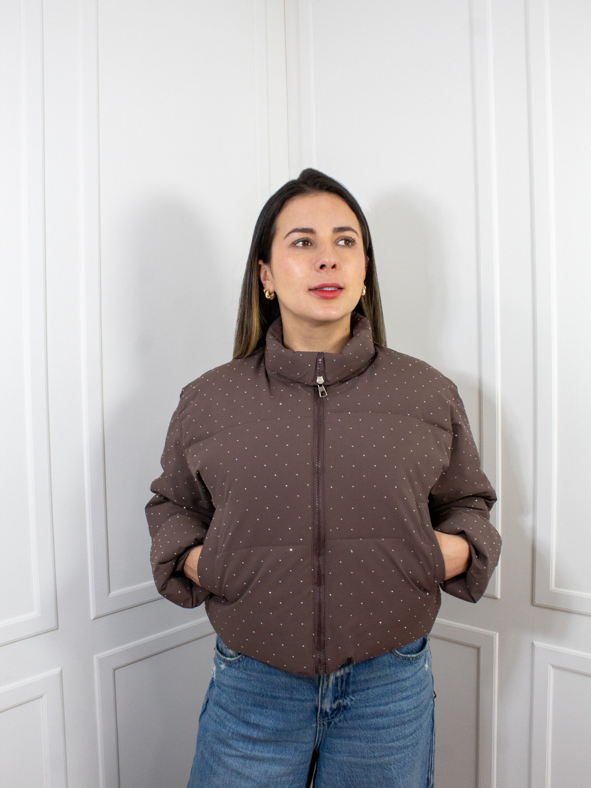 Chaqueta acolchada de silueta corta con diseño moderno y acabado brillante en micro puntos que aportan un efecto visual sutil y llamativo. Cuenta con cuello alto, cierre frontal completo y bolsillos laterales funcionales que brindan practicidad y abrigo. Su estructura ligera pero térmica ofrece comodidad, protección y estilo en una sola prenda.