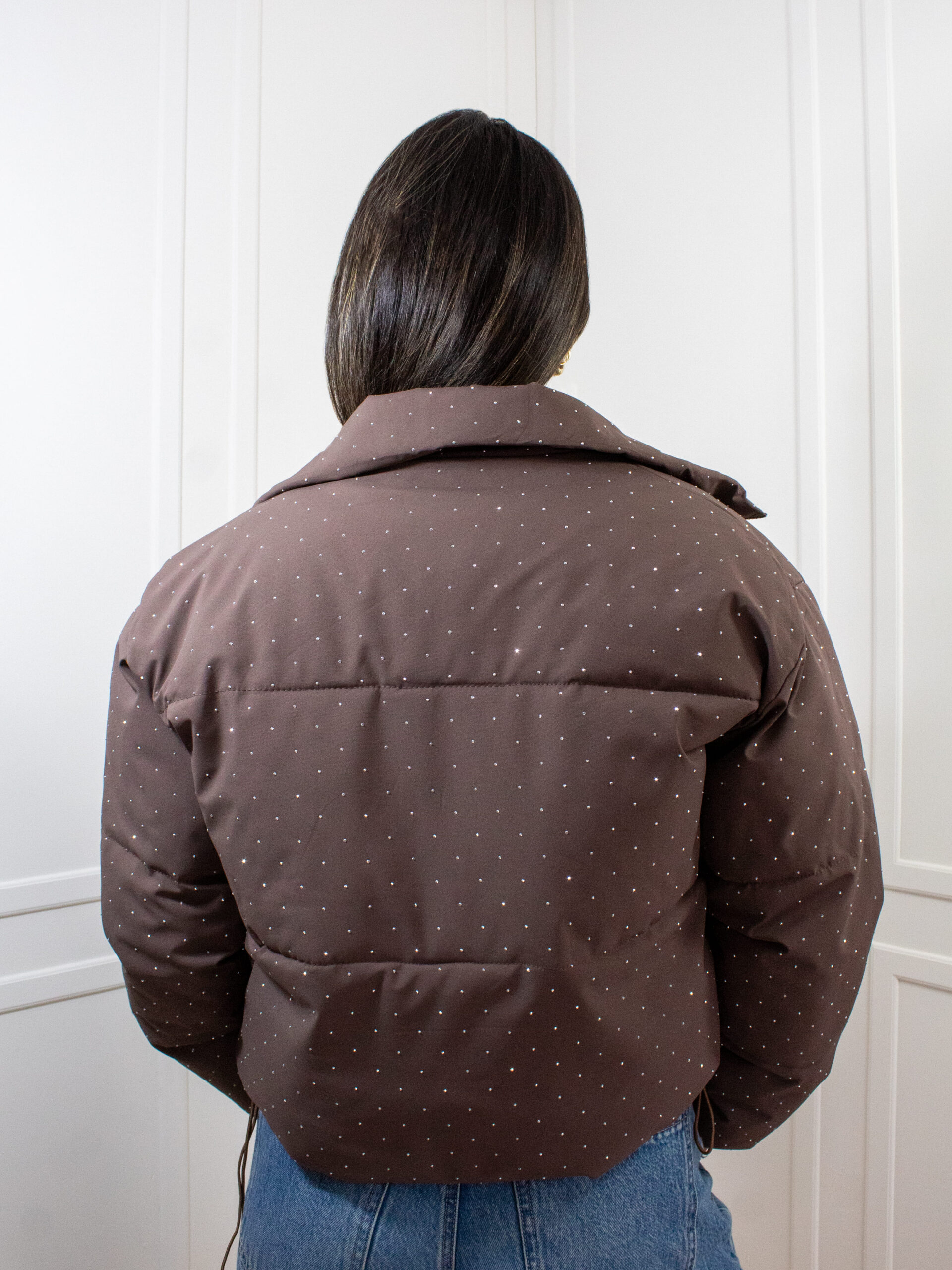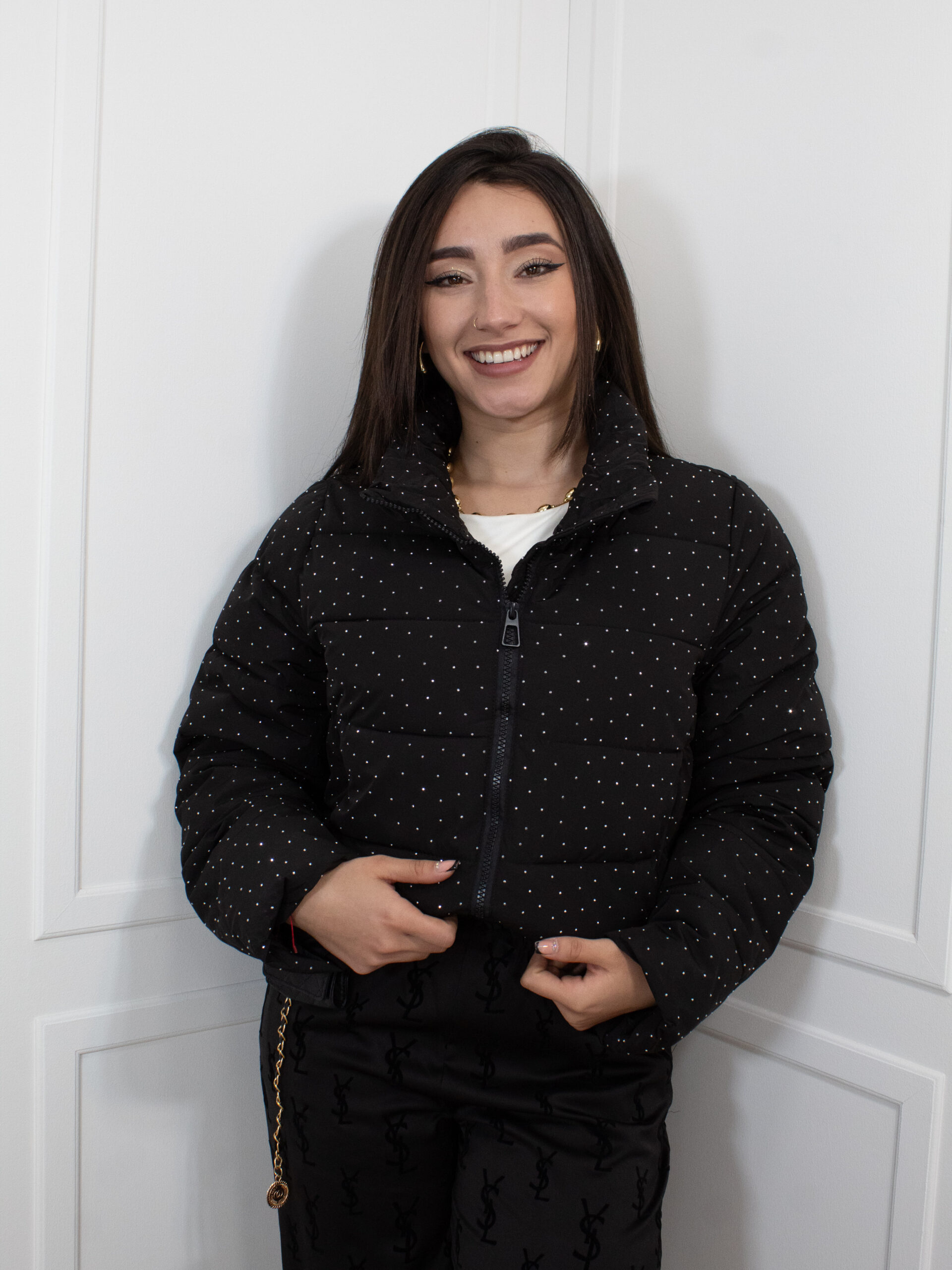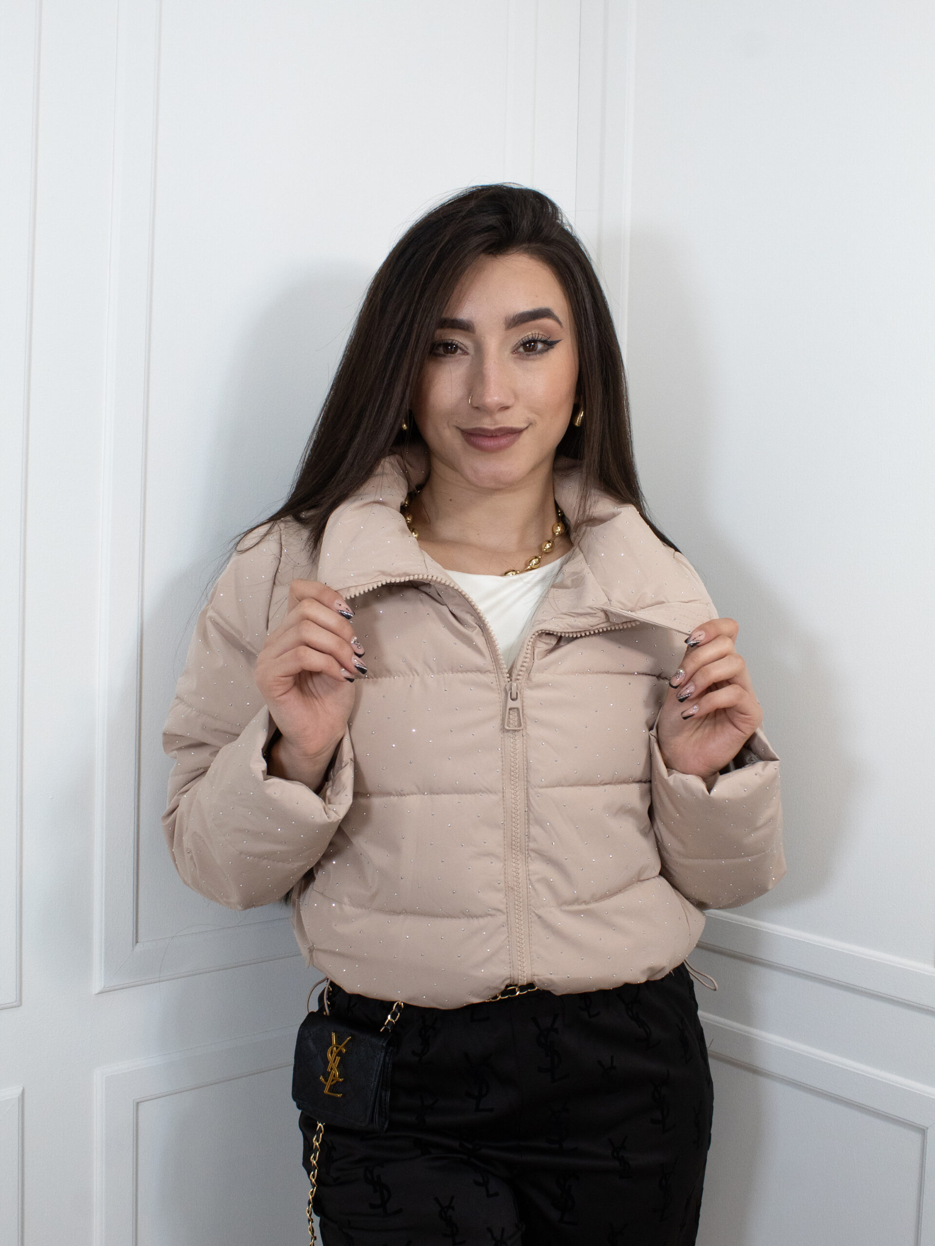 Chaqueta acolchada de silueta corta con diseño moderno y acabado brillante en micro puntos que aportan un efecto visual sutil y llamativo. Cuenta con cuello alto, cierre frontal completo y bolsillos laterales funcionales que brindan practicidad y abrigo. Su estructura ligera pero térmica ofrece comodidad, protección y estilo en una sola prenda.