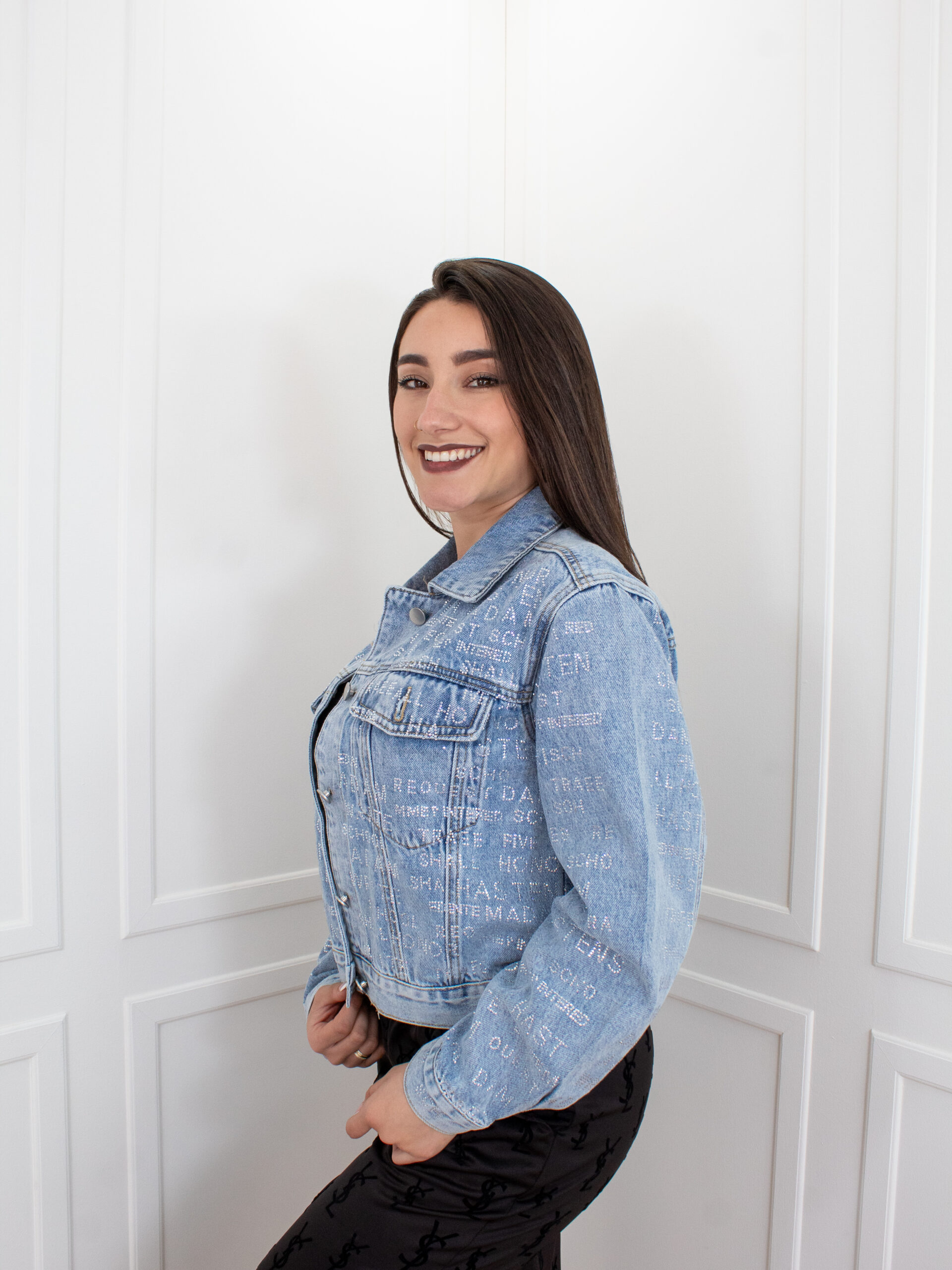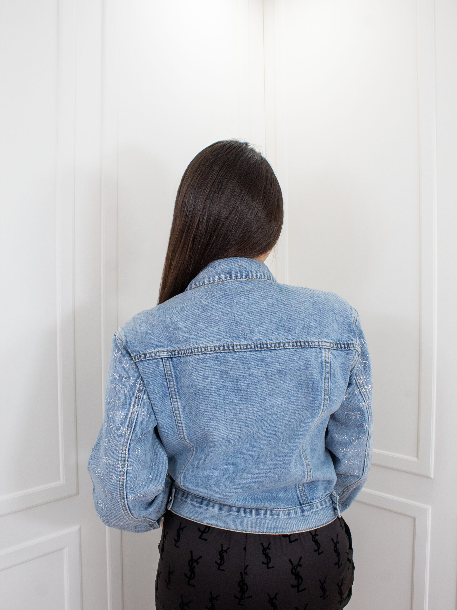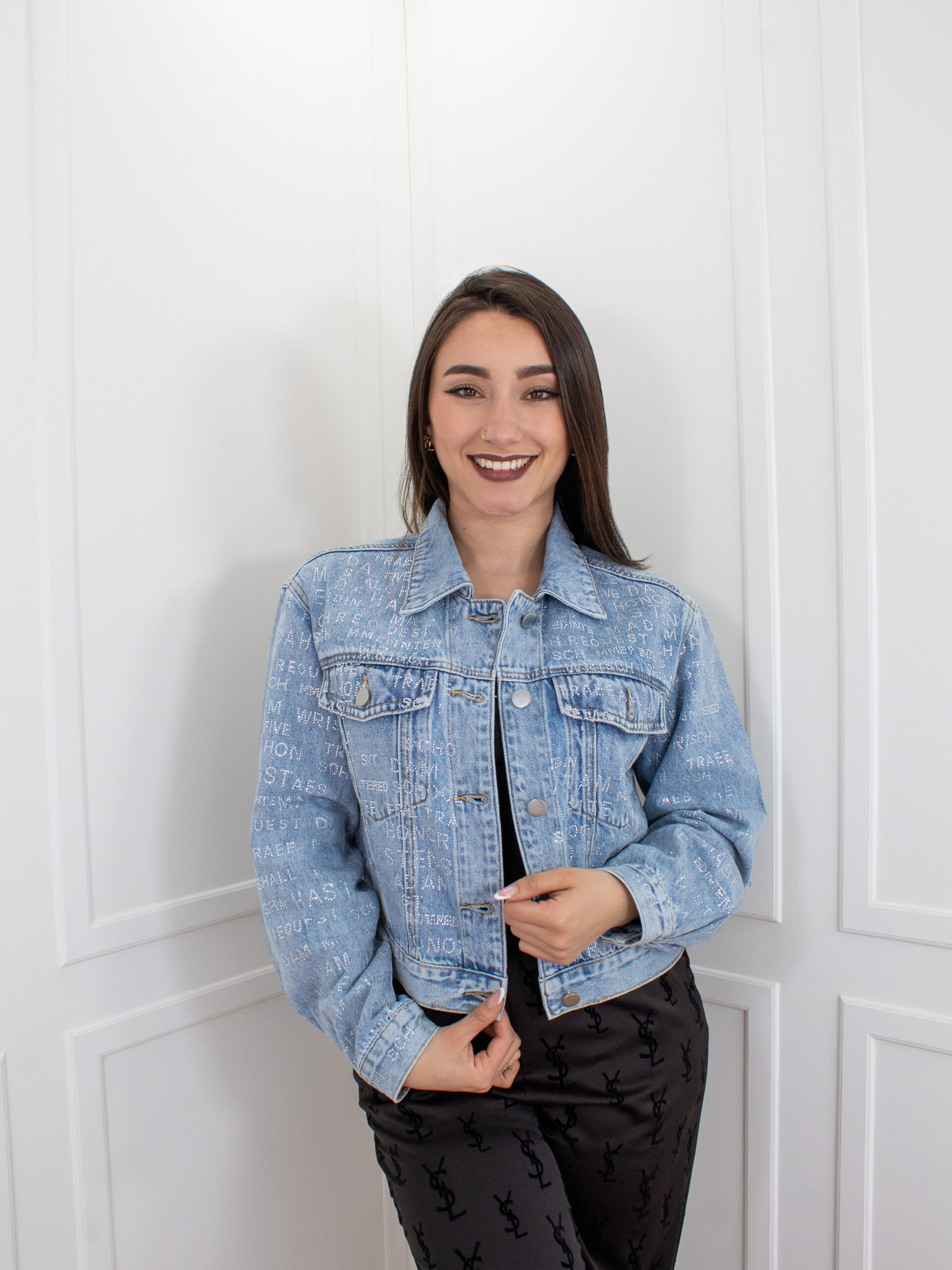 Chaqueta jean tradicional con un acabado distintivo de microbrillos tipográficos distribuidos en toda la prenda, creando un efecto sutil pero impactante que resalta con la luz. Su silueta estructurada realza la figura sin perder comodidad, mientras que el lavado azul claro aporta frescura y versatilidad para múltiples combinaciones. Cuenta con botones metálicos frontales, bolsillos funcionales y costuras definidas que aportan carácter y durabilidad.