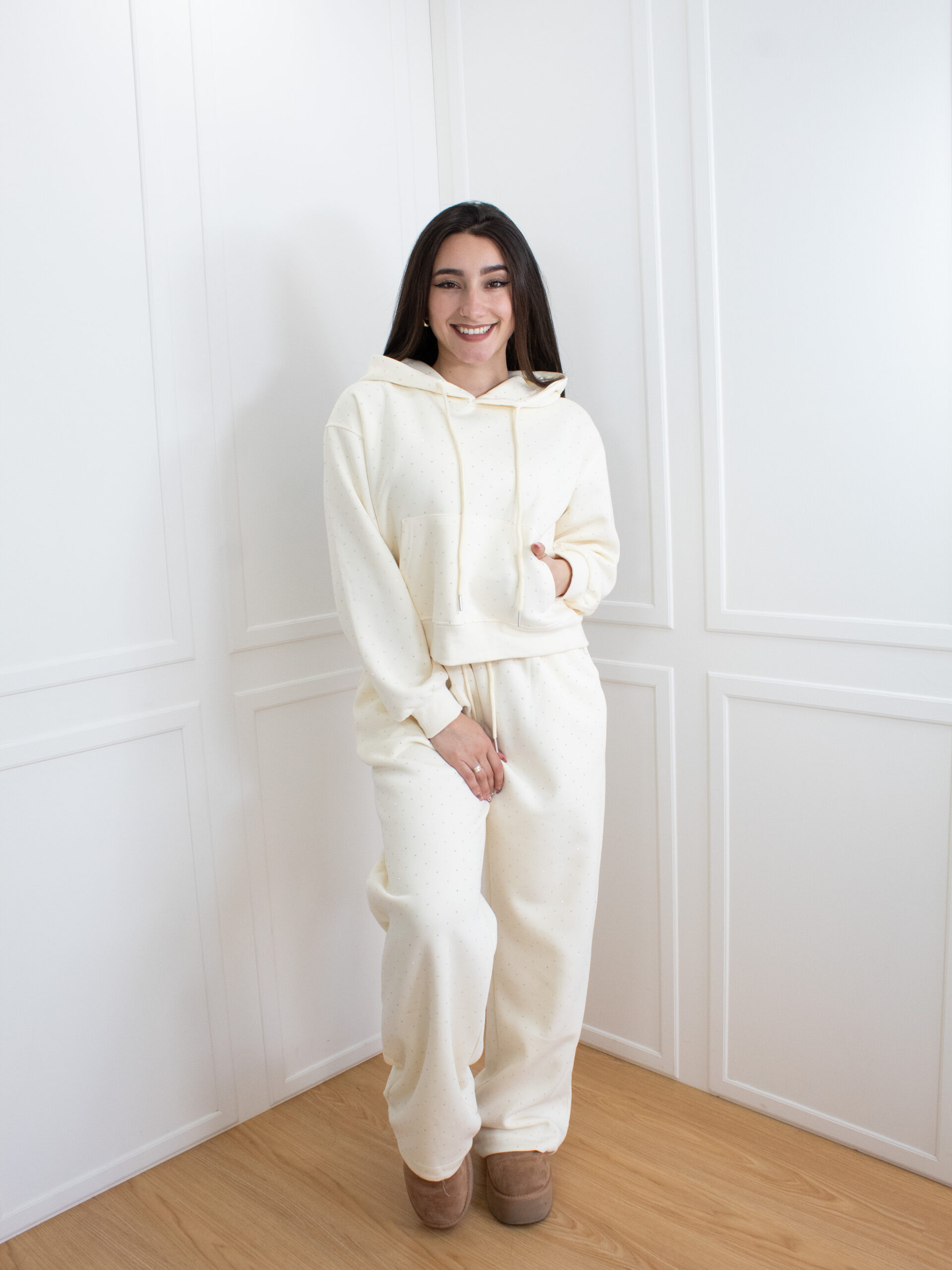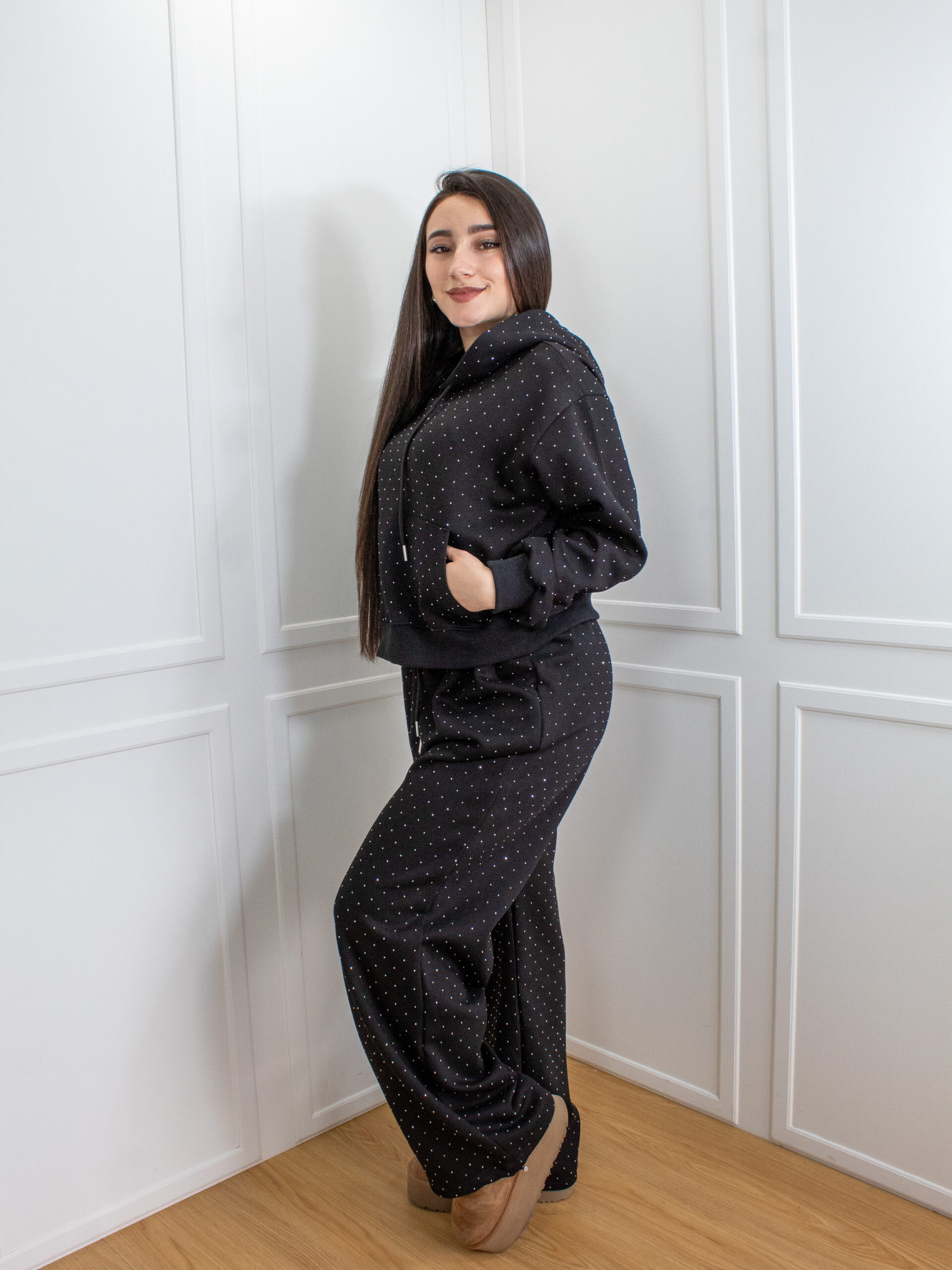 Este conjunto destaca por su comodidad y estilo relajado, ideal para quienes buscan un look moderno sin renunciar al confort. Compuesto por una sudadera con un toque de brillos, capota y bolsillo tipo canguro, junto con un pantalón de corte amplio, ofrece libertad de movimiento y una silueta fluida.