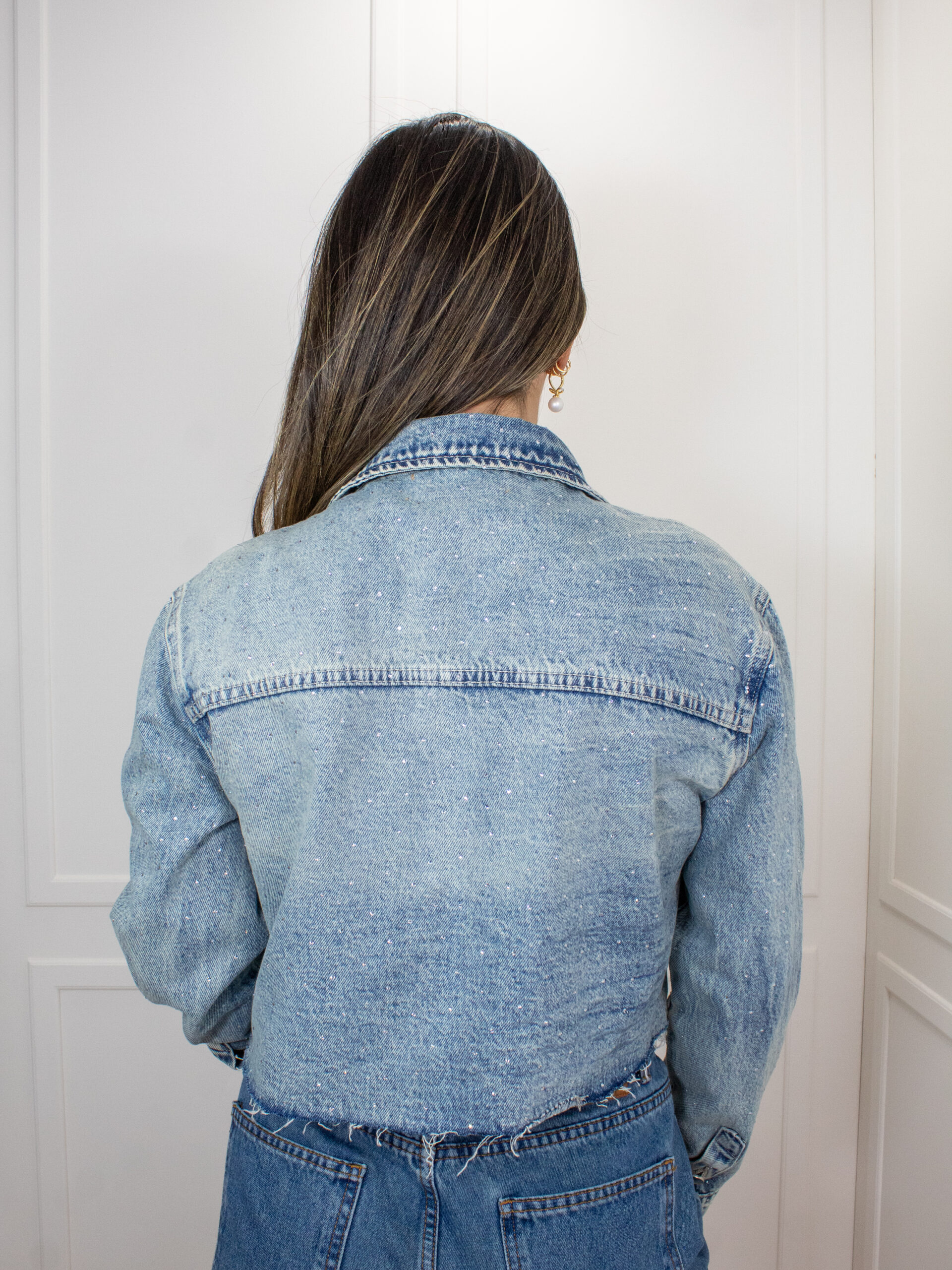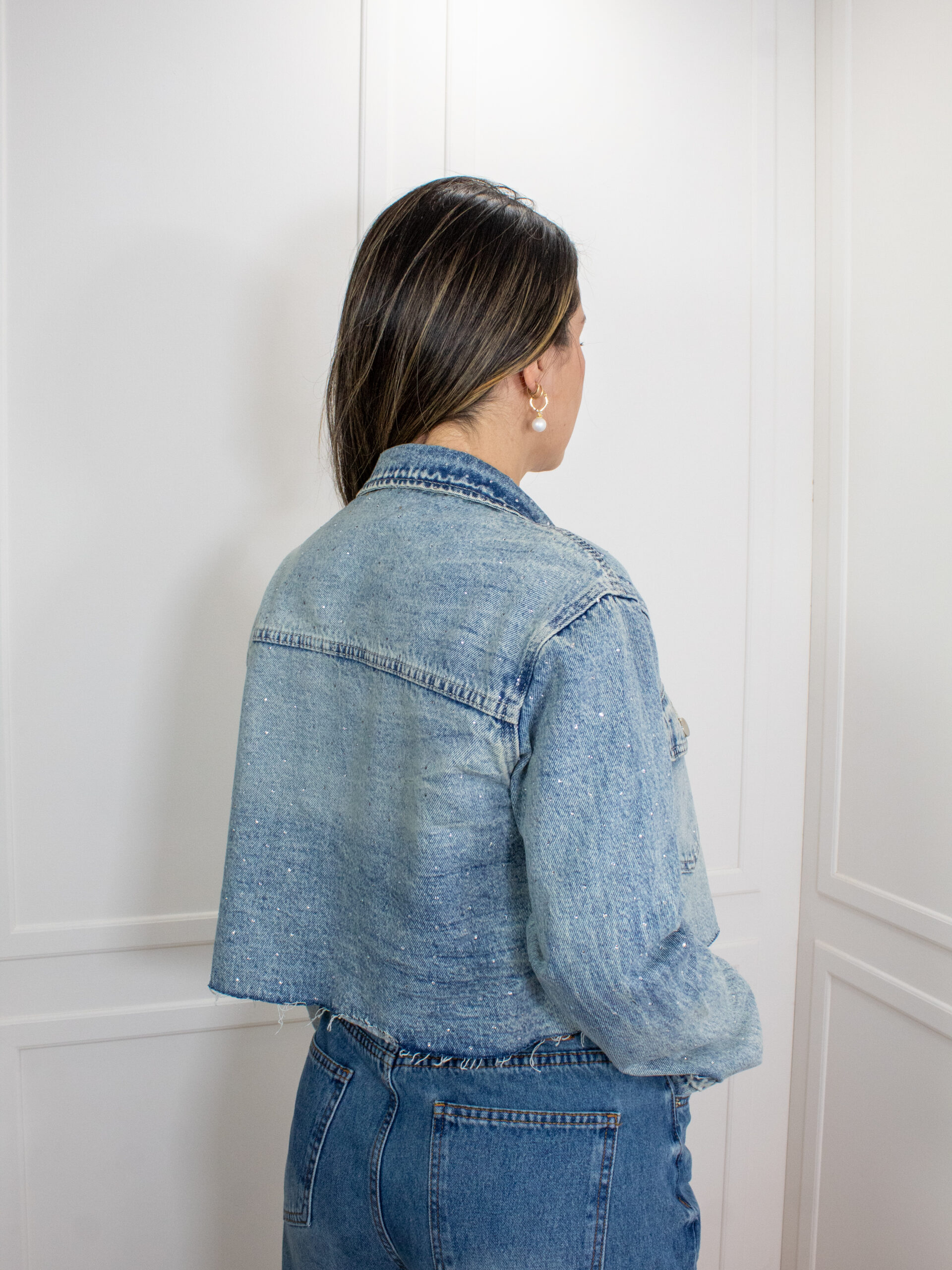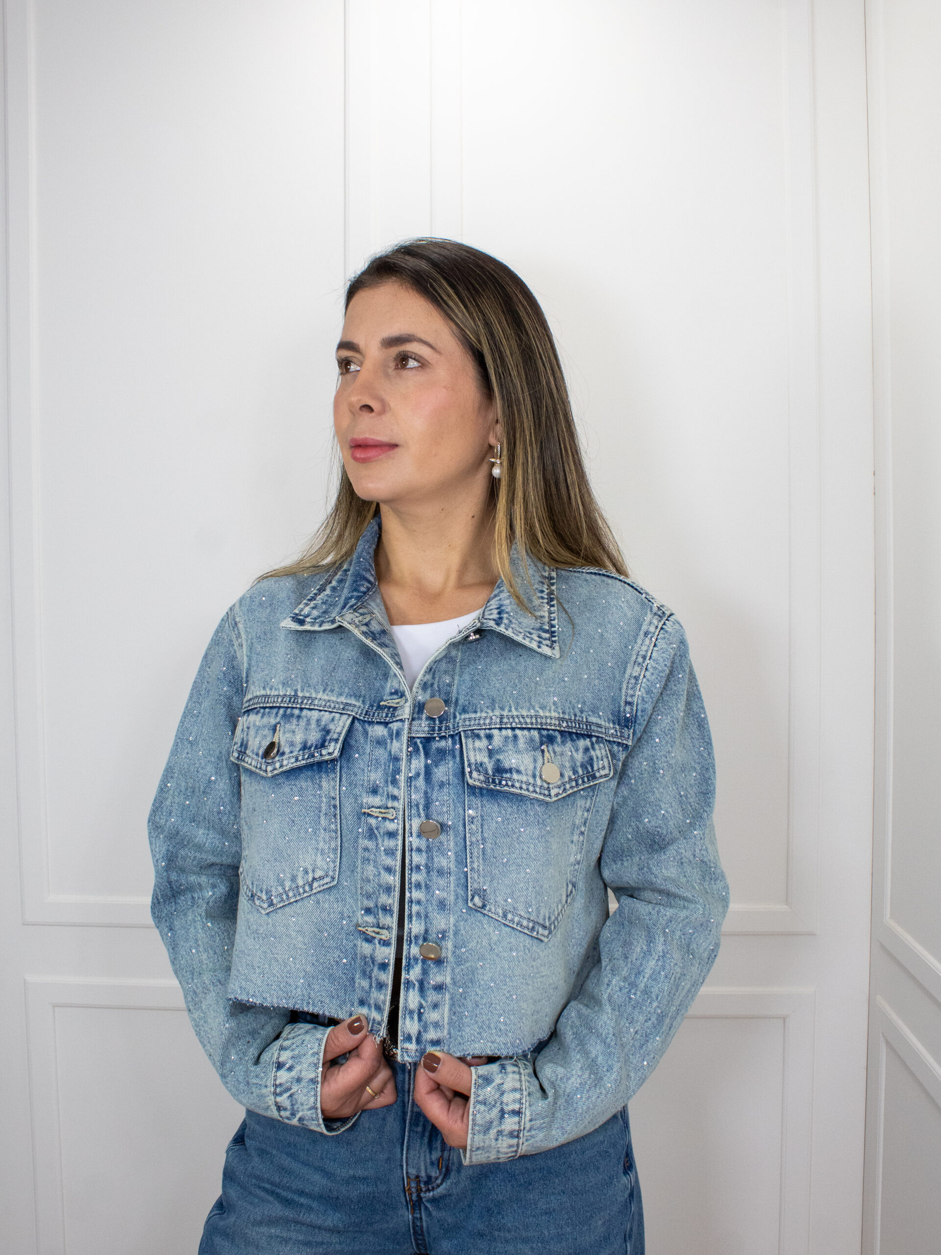 Esta moderna chaqueta denim combina un estilo clásico con detalles de tendencia para crear una pieza imprescindible. Su diseño se caracteriza por un corte cropped y bordes deshilachados, que le otorgan un aire casual y contemporáneo. El tejido de jean presenta un acabado sutilmente moteado o salpicado de luz, añadiendo una textura visual única y un toque de originalidad.