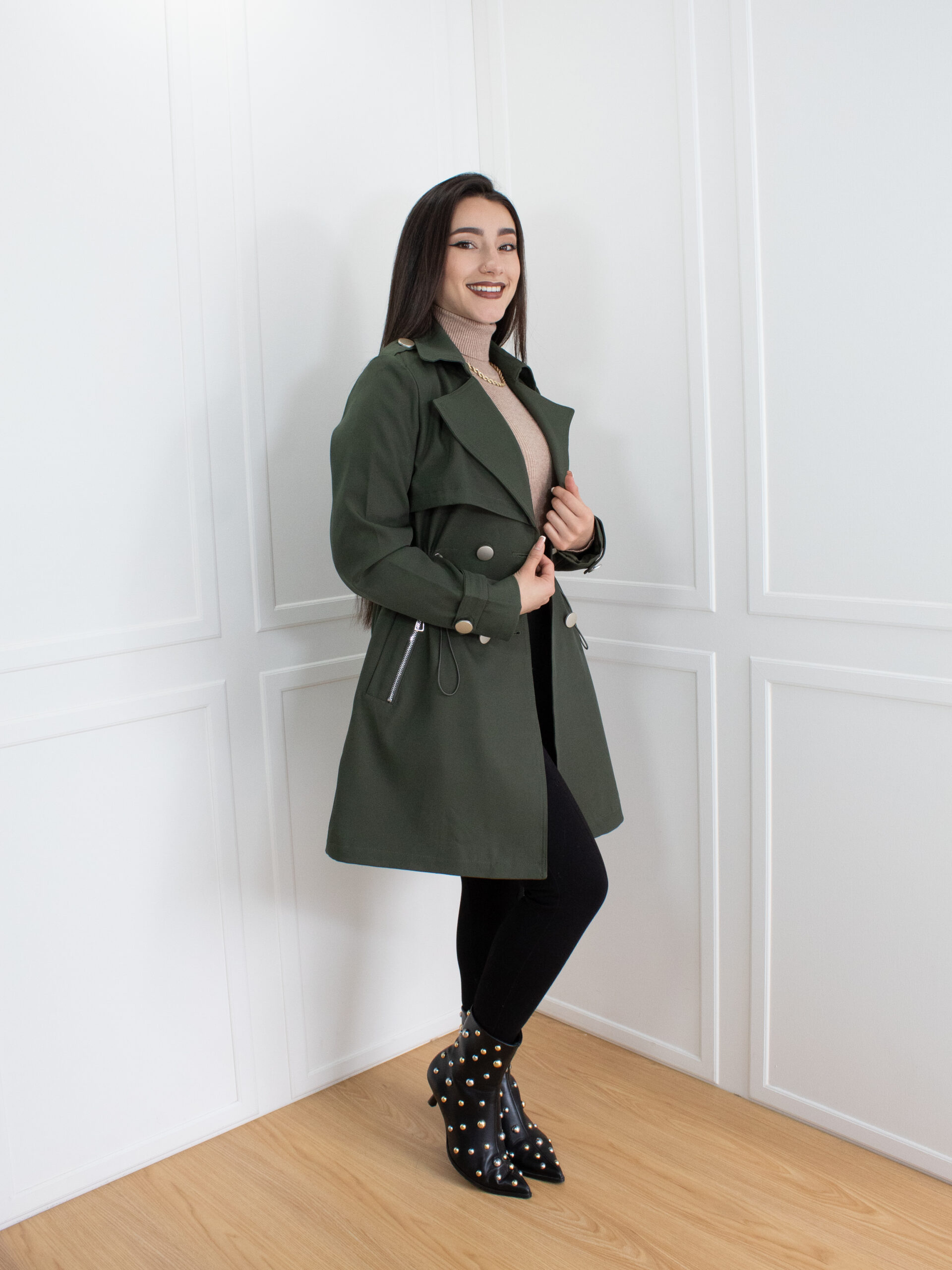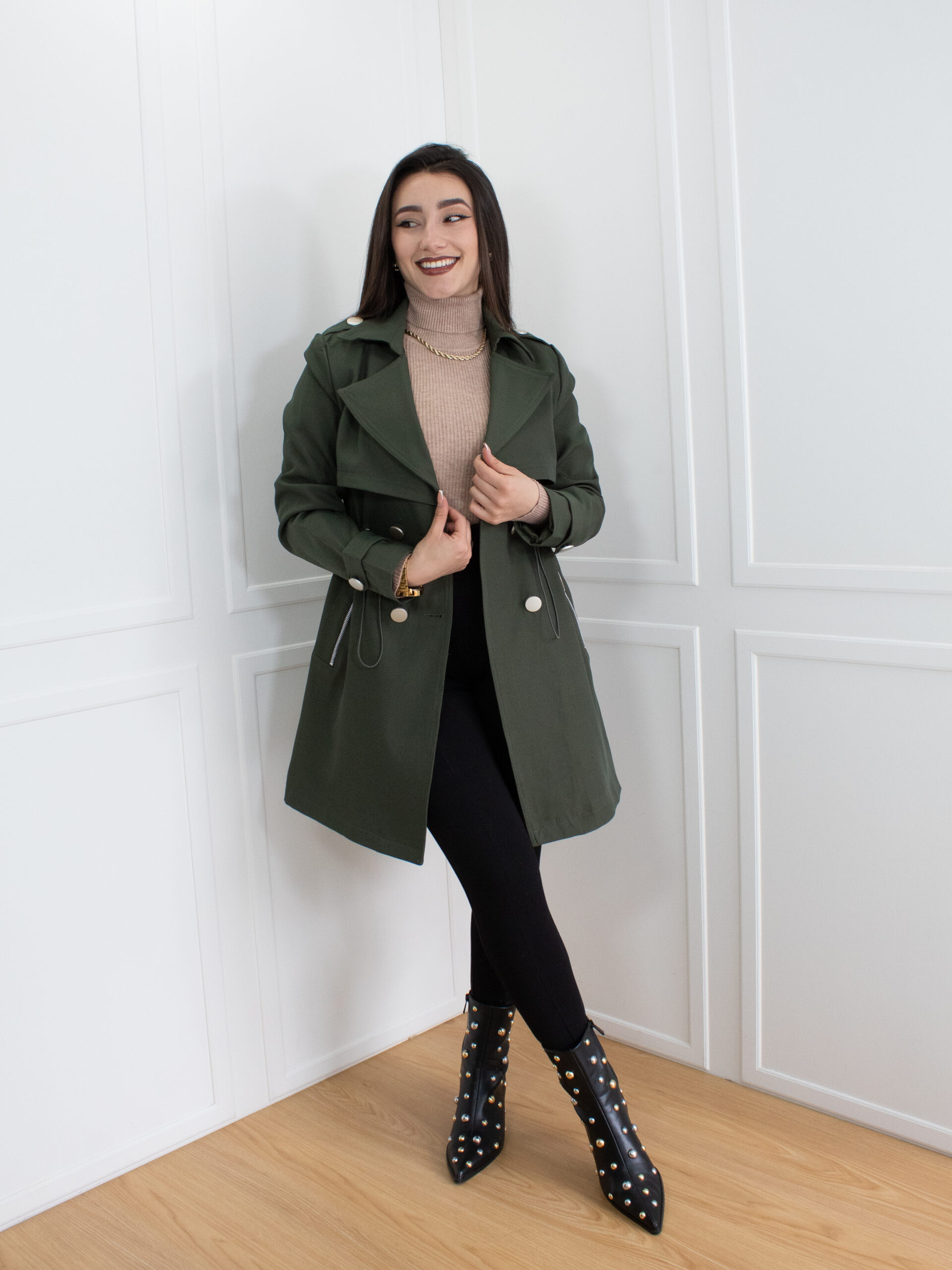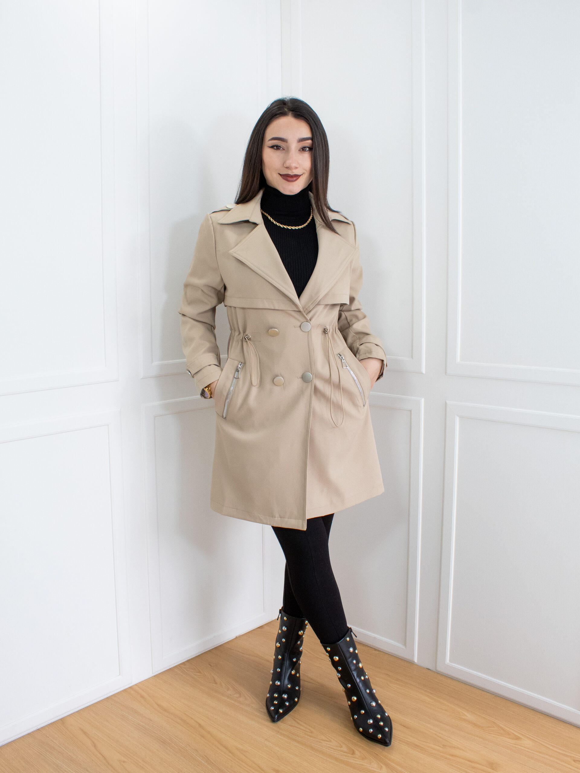 Gabardina elegante con doble botonadura al frente, bolsillos con cierre metálico y solapa amplia.