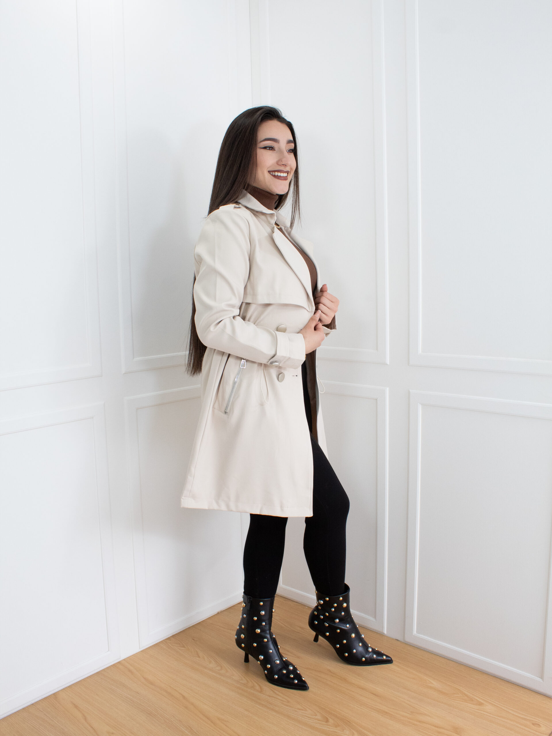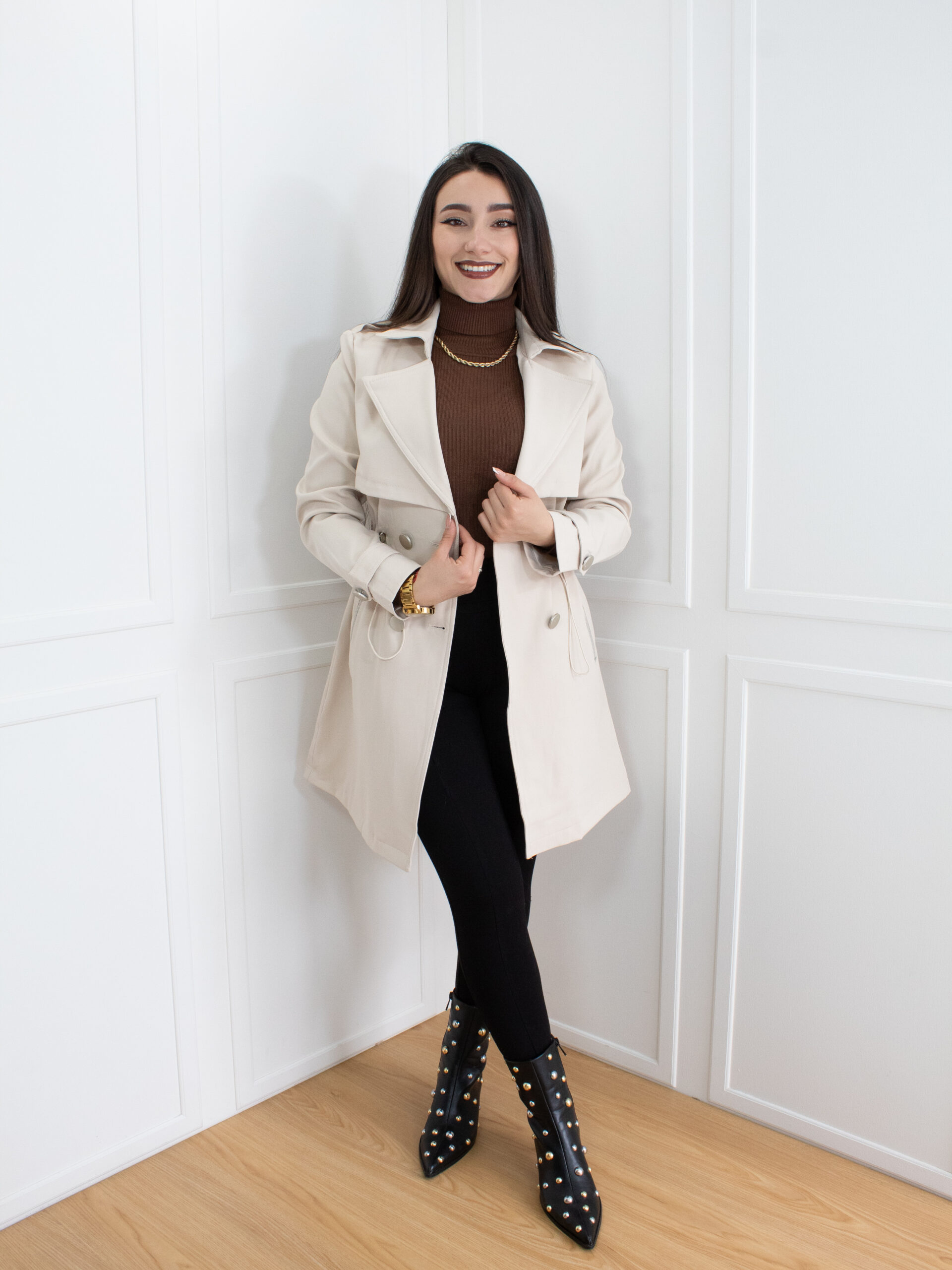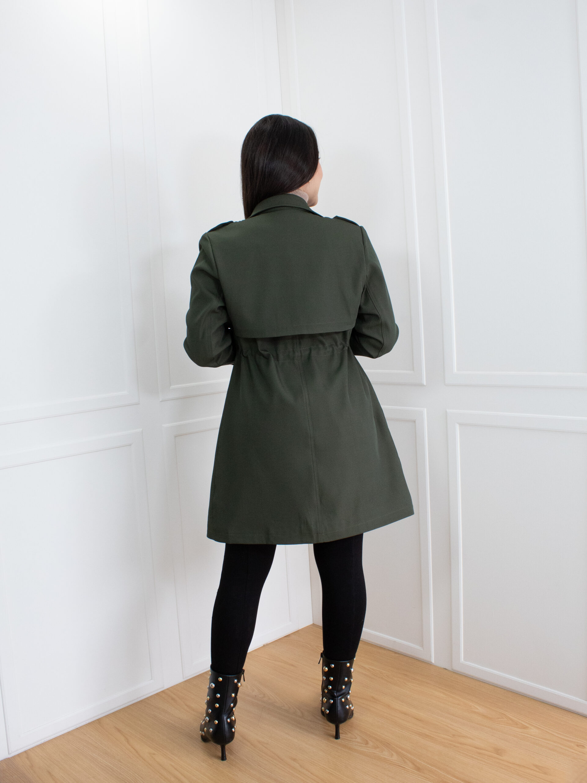 Gabardina elegante con doble botonadura al frente, bolsillos con cierre metálico y solapa amplia.