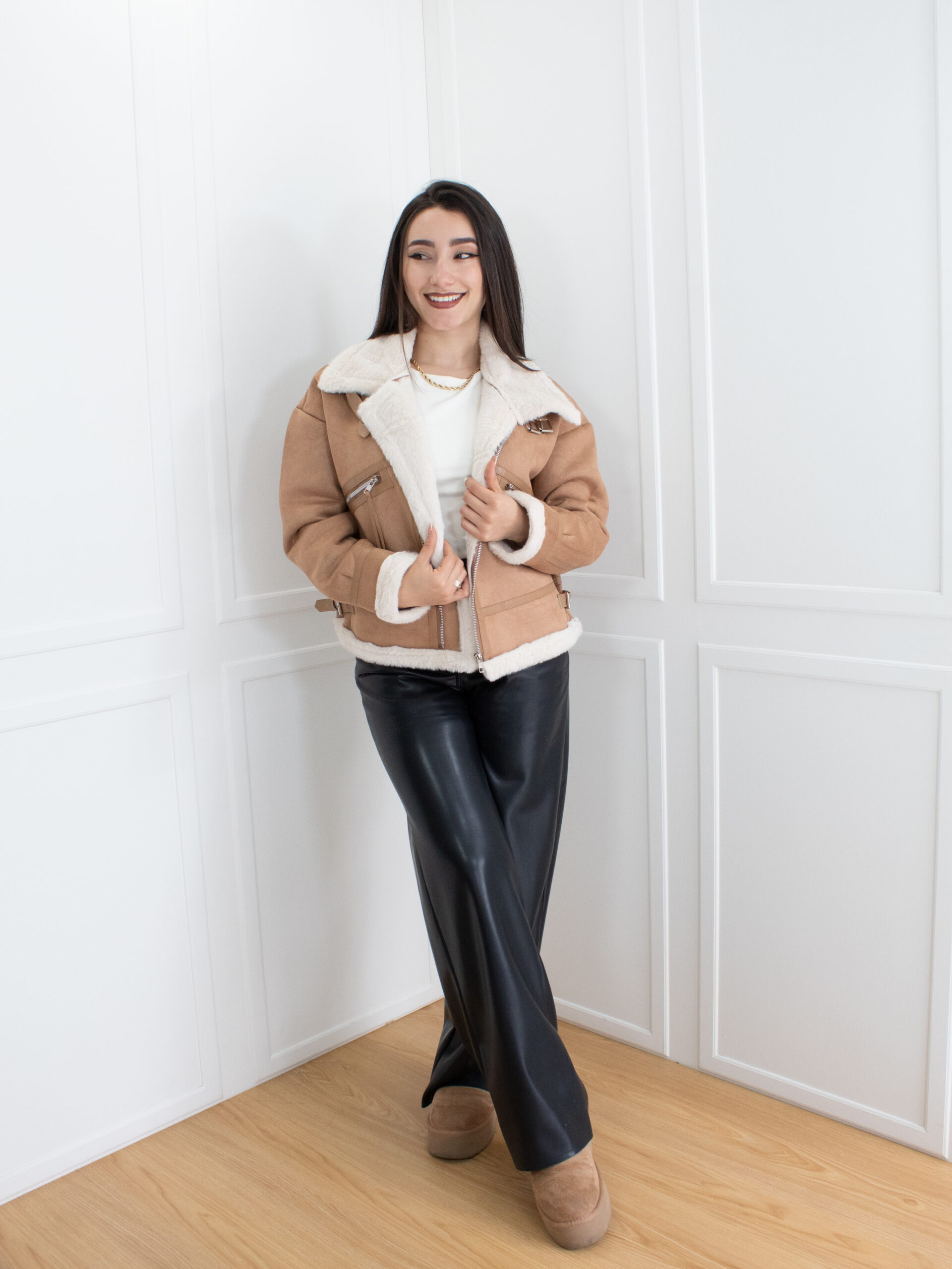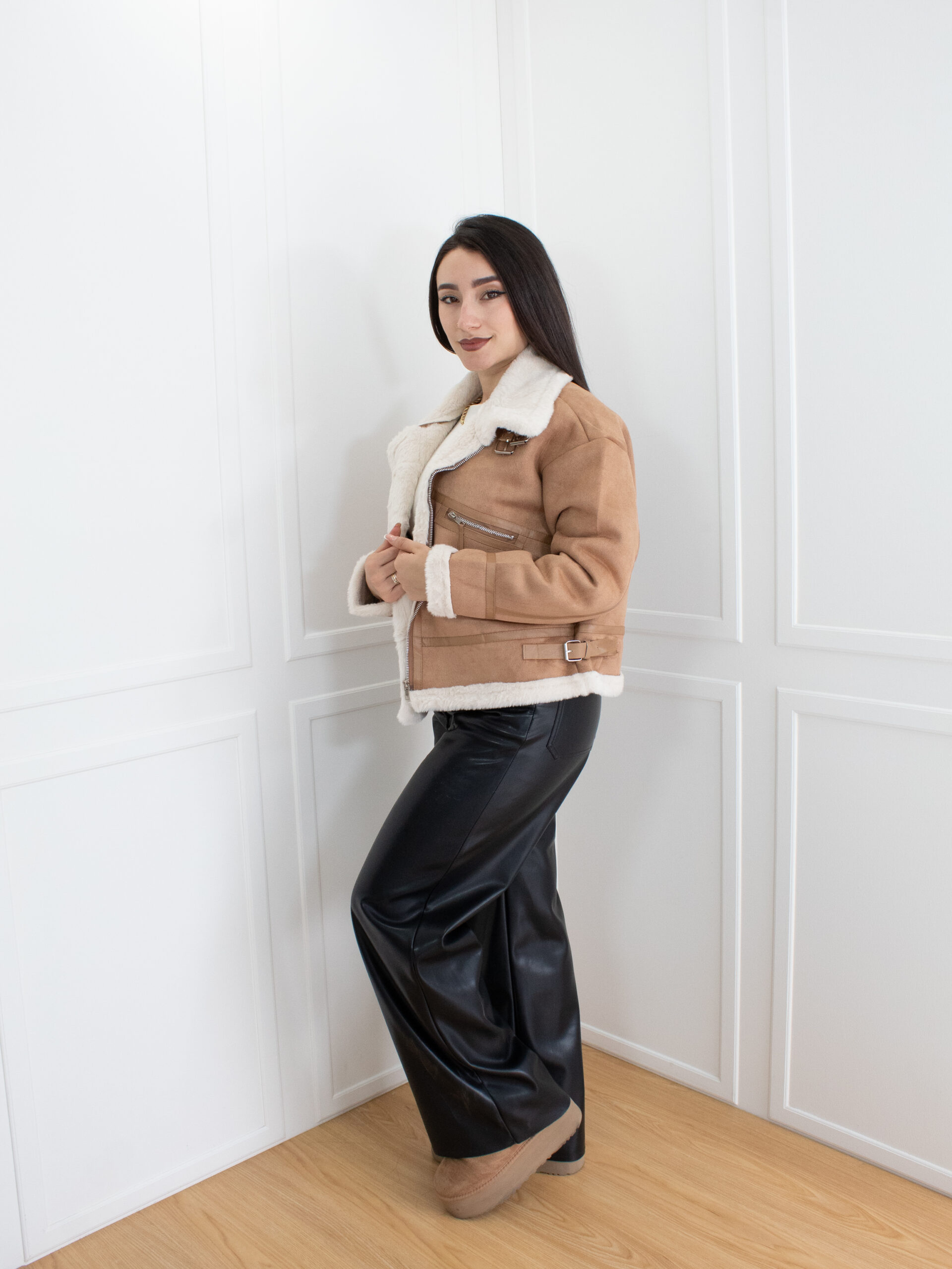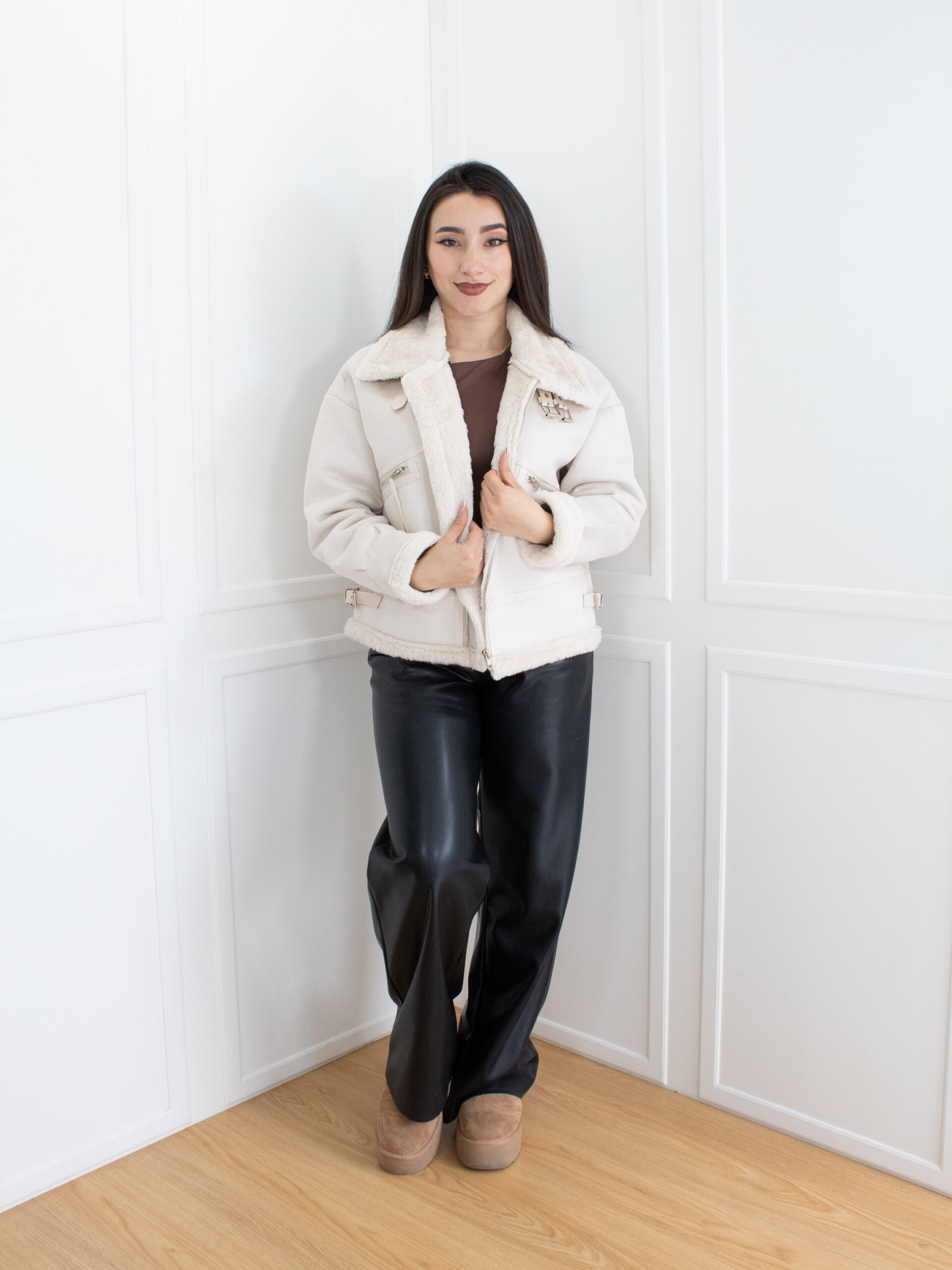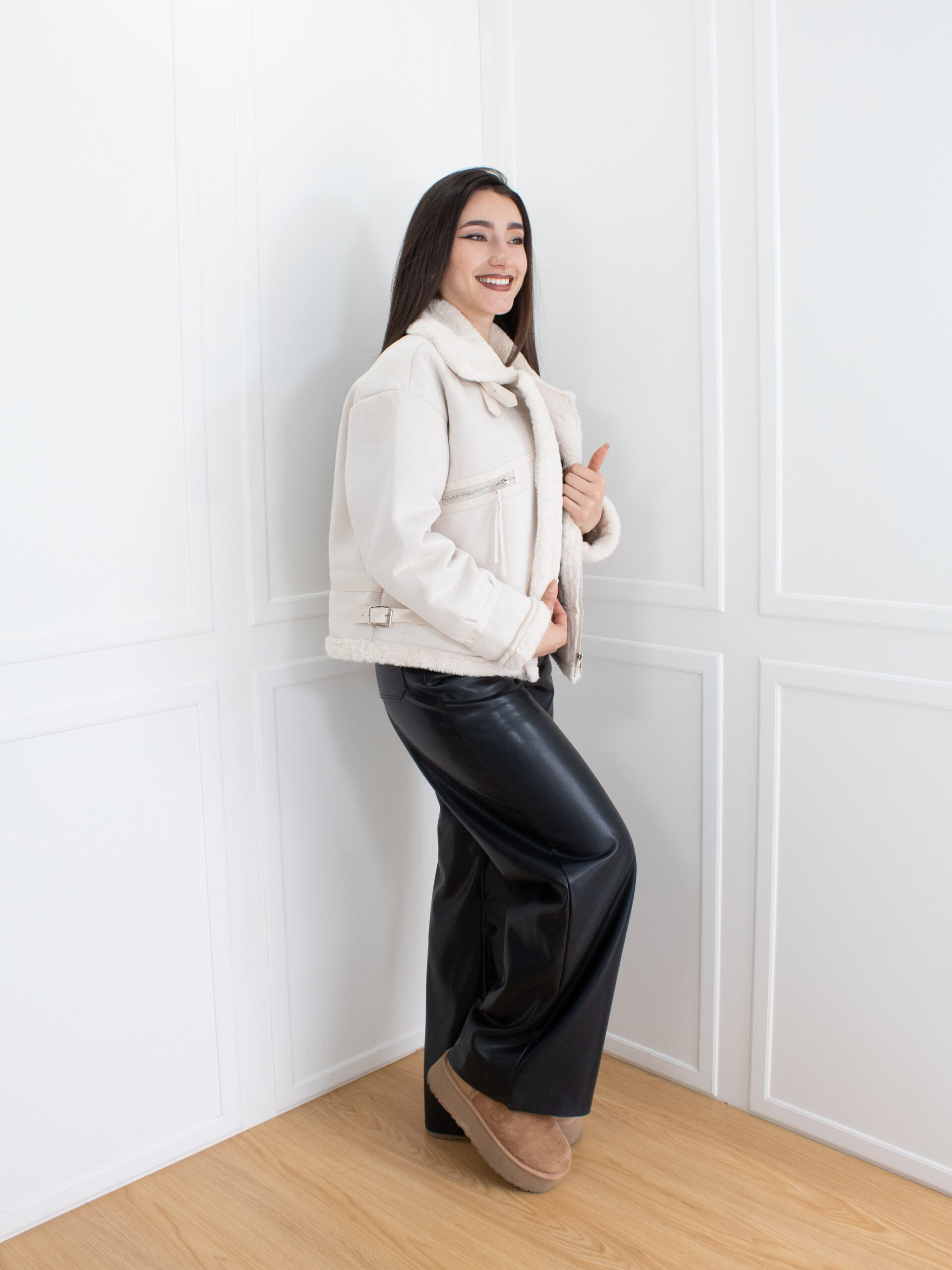 Cazadora con interior afelpado, cuello amplio y cierres metálicos decorativos. Su diseño combina comodidad y carácter, perfecta para looks con un toque moderno.