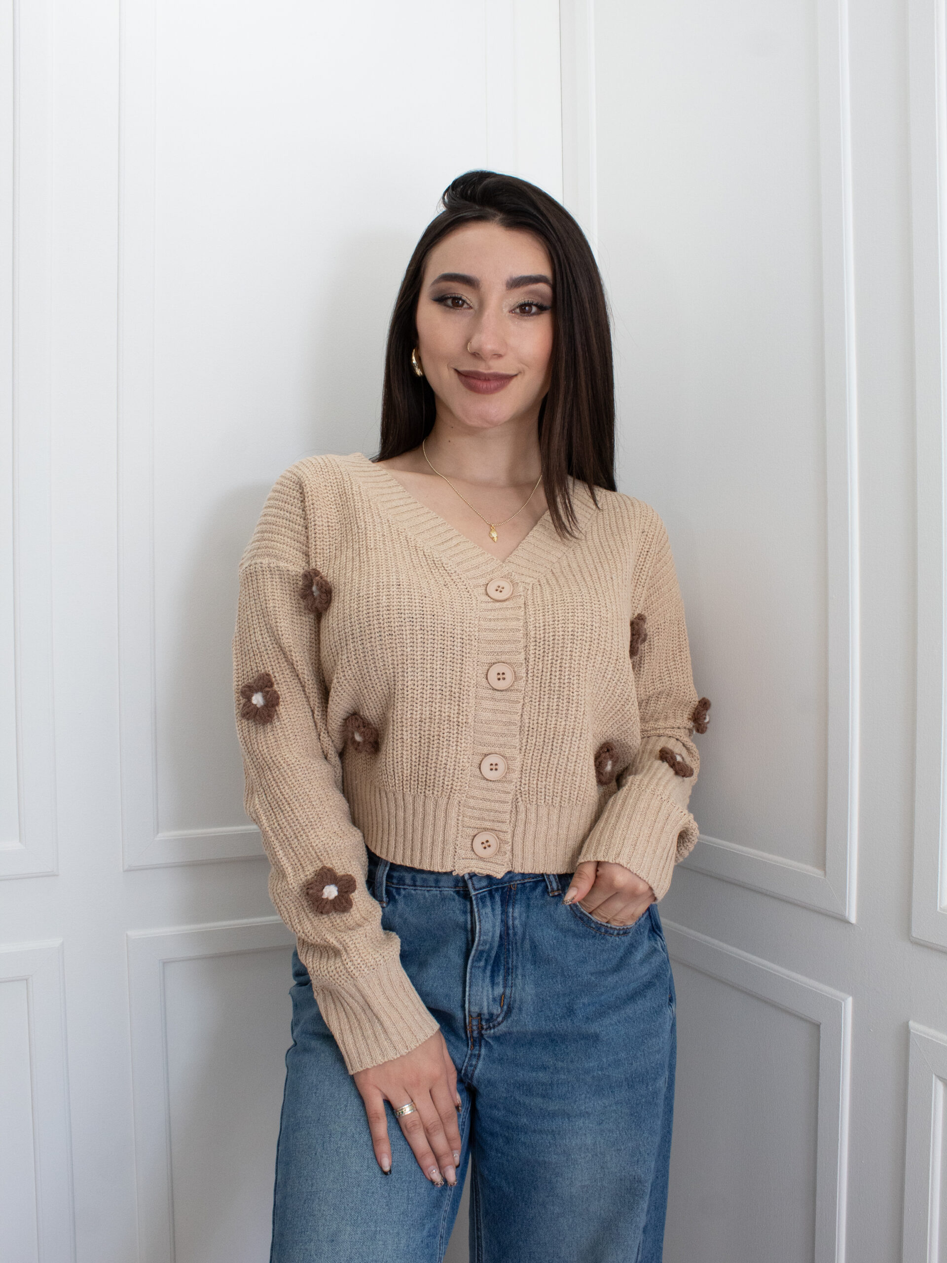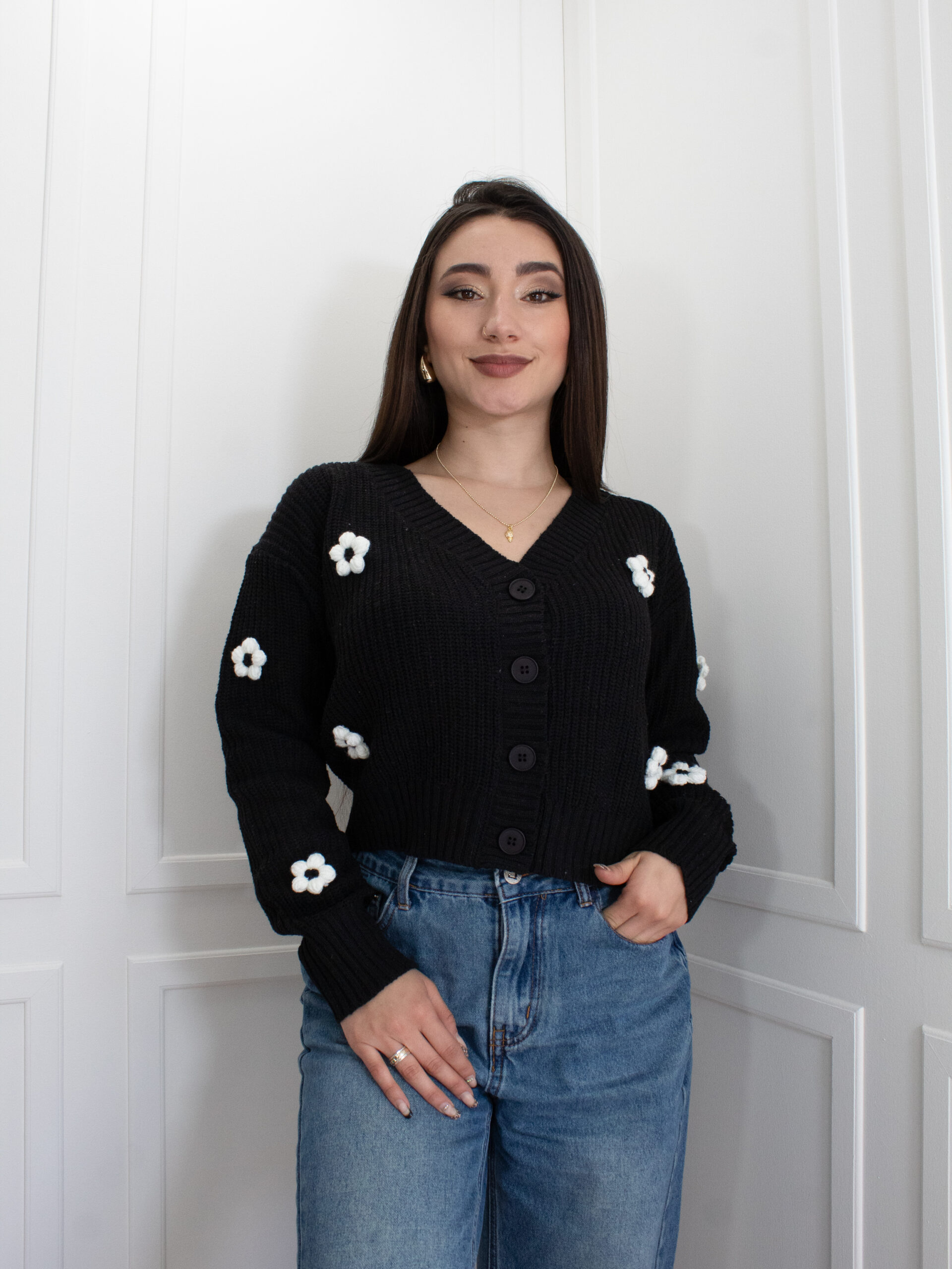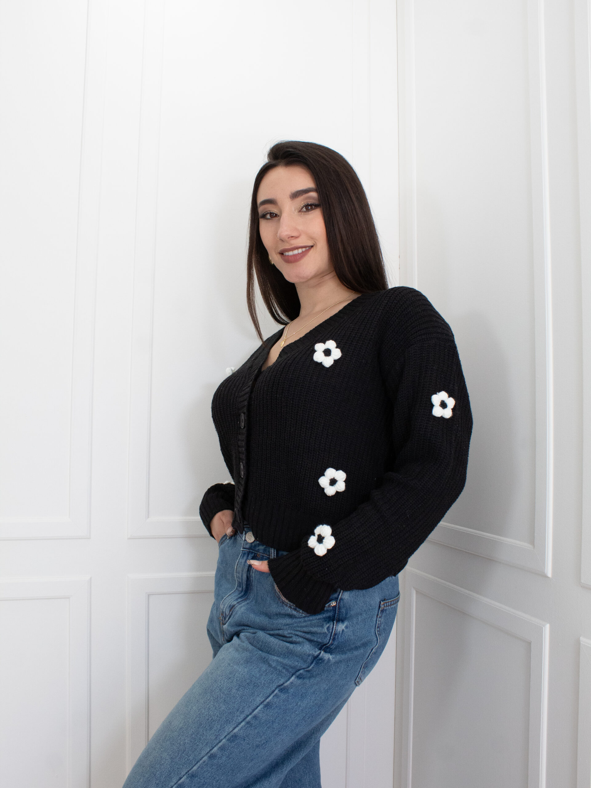 Este tejido destaca por su diseño moderno y femenino, elaborado en punto grueso con un acabado cálido y confortable. Su silueta corta realza la cintura y aporta un aire juvenil, mientras que los botones frontales permiten llevarlo abierto o cerrado según la ocasión. Como detalle distintivo, incorpora aplicaciones en forma de flores que añaden un toque delicado y encantador, logrando una prenda versátil que combina perfectamente con diferentes estilos, desde lo casual hasta lo más romántico.
