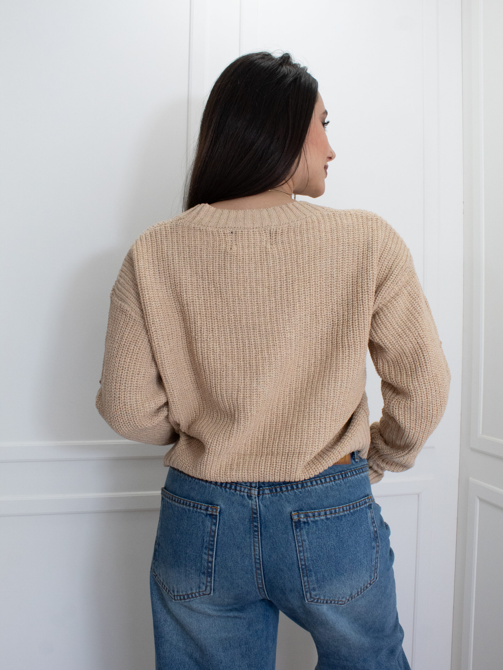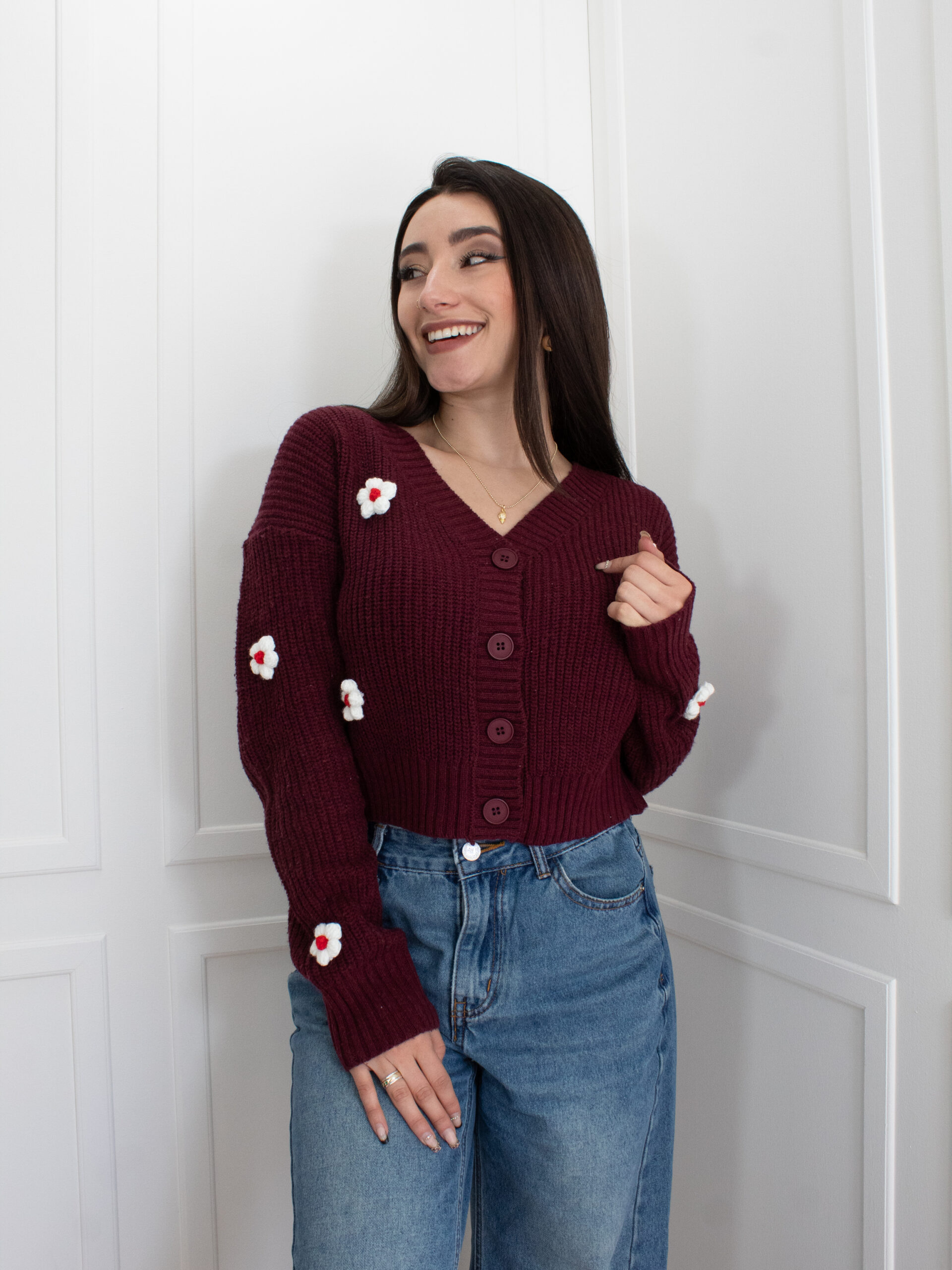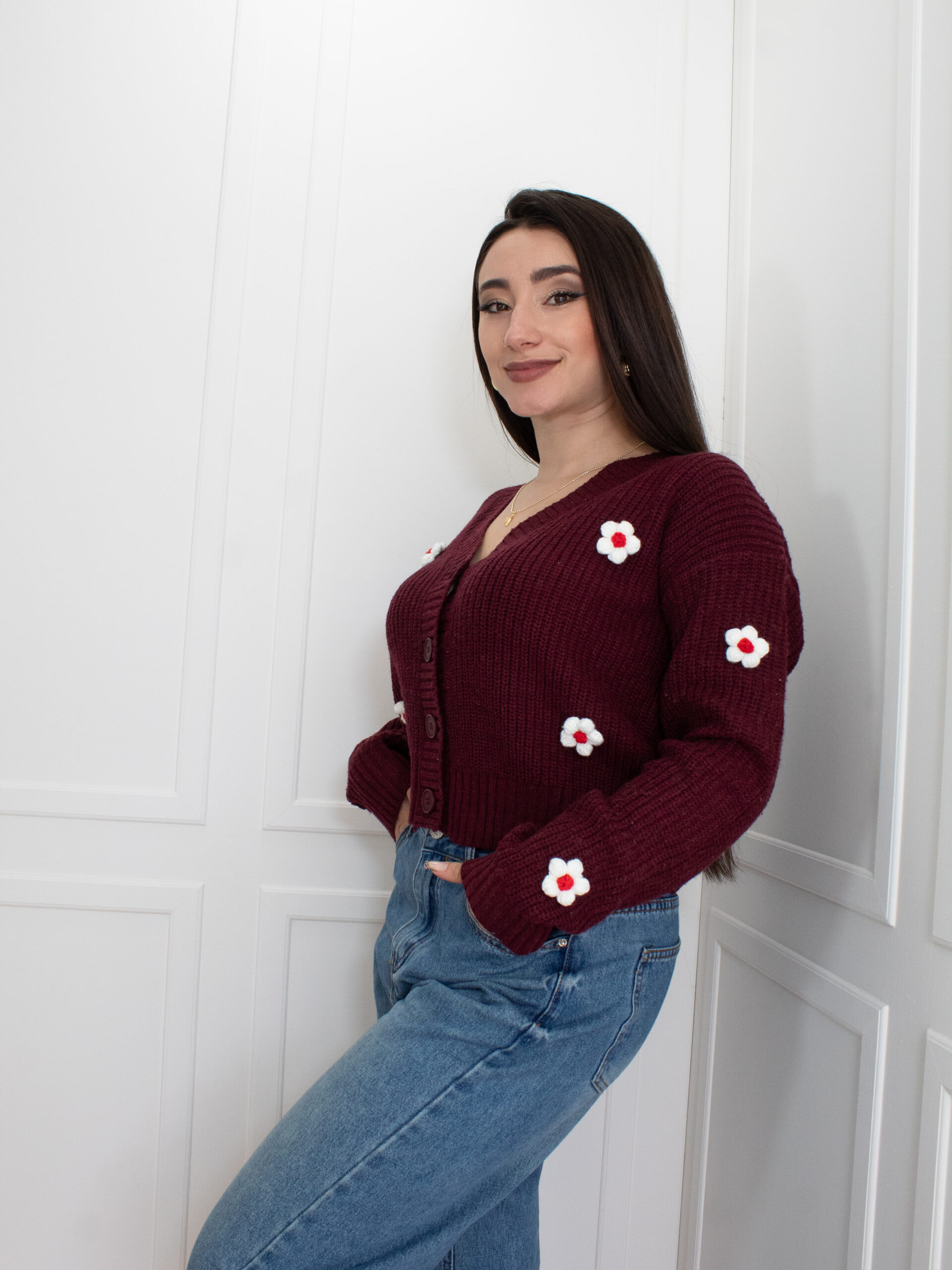 Este tejido destaca por su diseño moderno y femenino, elaborado en punto grueso con un acabado cálido y confortable. Su silueta corta realza la cintura y aporta un aire juvenil, mientras que los botones frontales permiten llevarlo abierto o cerrado según la ocasión. Como detalle distintivo, incorpora aplicaciones en forma de flores que añaden un toque delicado y encantador, logrando una prenda versátil que combina perfectamente con diferentes estilos, desde lo casual hasta lo más romántico.